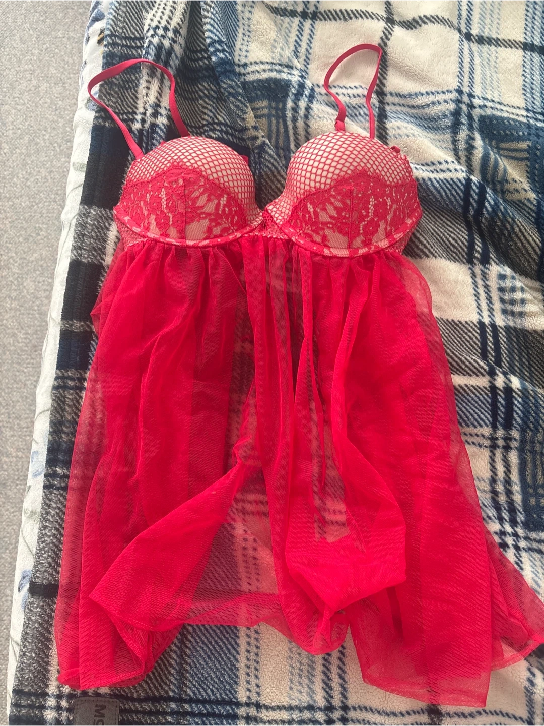 A red lingerie set, perfect for a special occasion or to add a little spice to your wardrobe. It features lace detailing and a flowing, sheer fabric. It's in great condition and ready for a new home! Pick up cash only
