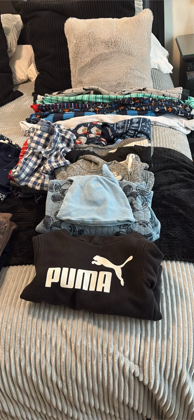 A mixed lot of baby and toddler clothing! There's a variety of items including shirts, pants, onesies, and more. Brands include Puma, Carter's and H&M. Perfect for stocking up on essentials!