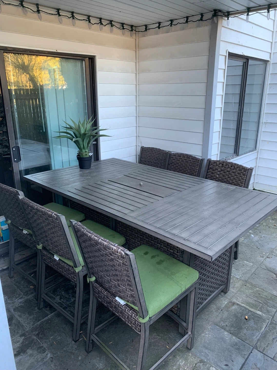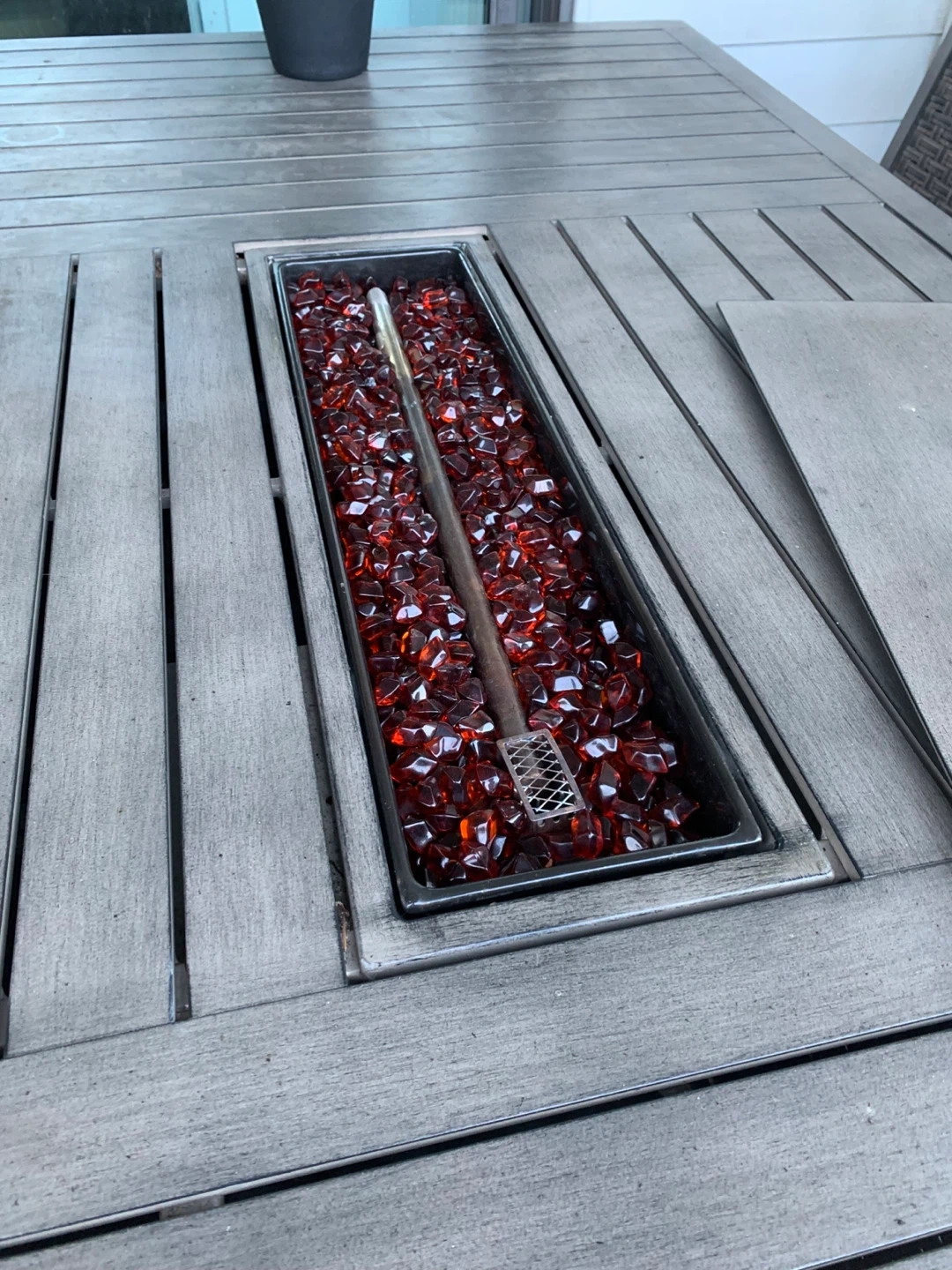 Selling an outdoor dining table that features a built-in fire pit in the center. It comes with red fire glass and a cover for the fire pit when not in use. The table has a cabinet base, perfect for storing a propane tank or other outdoor essentials. Chairs are also included!