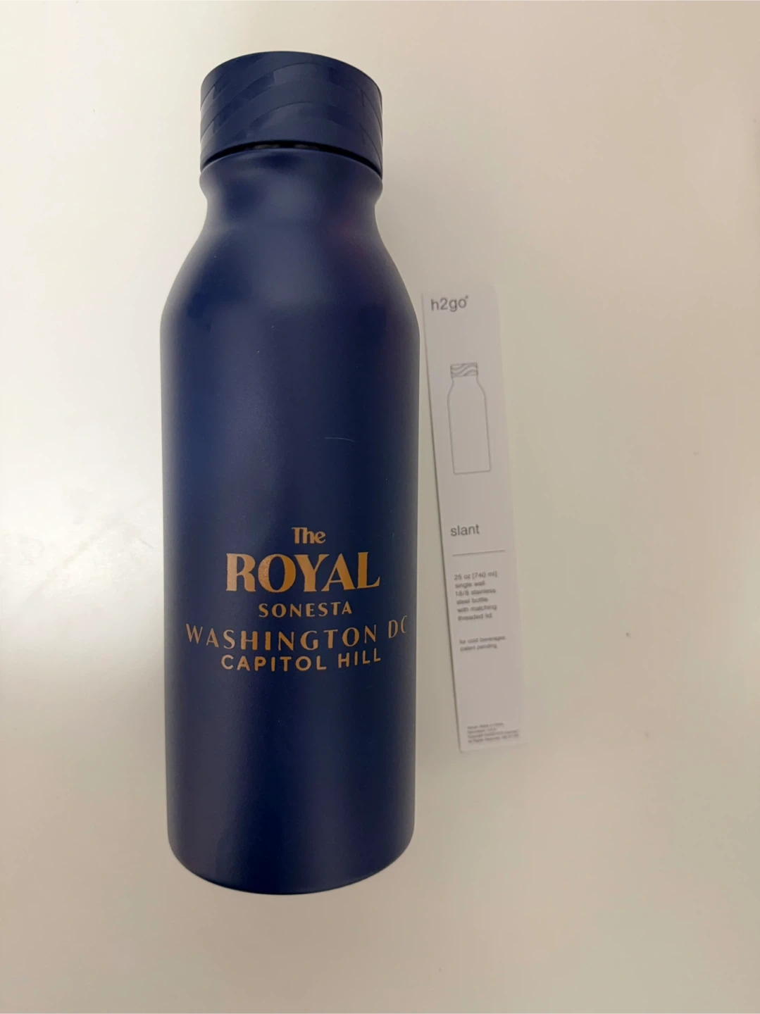 This navy h2go water bottle has The Royal Sonesta Washington DC Capitol Hill branding. It's 25 oz (740 ml) and made of stainless steel. It comes with a matching threaded lid.