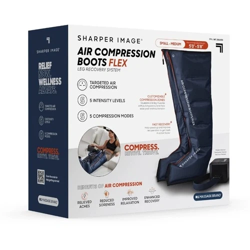 Sharper Image Powerboost Boots offer a comfortable and effective way to relax your legs. Using advanced air compression technology, these boots target sore muscles for faster recovery. You can customize your experience with options for using one or both boots, plus five levels of intensity, five compression modes, and five zone settings. The controls are easy to use, and the boots fold up for convenient storage or travel. They help reduce muscle fatigue and speed up recovery. Soothing air compression provides relief for tight and sore leg muscles. The control unit is intuitive for easy operation. This S/M size fits inseams from 25" to 31". The design is convenient and easy to store, folding up or hanging when not in use.