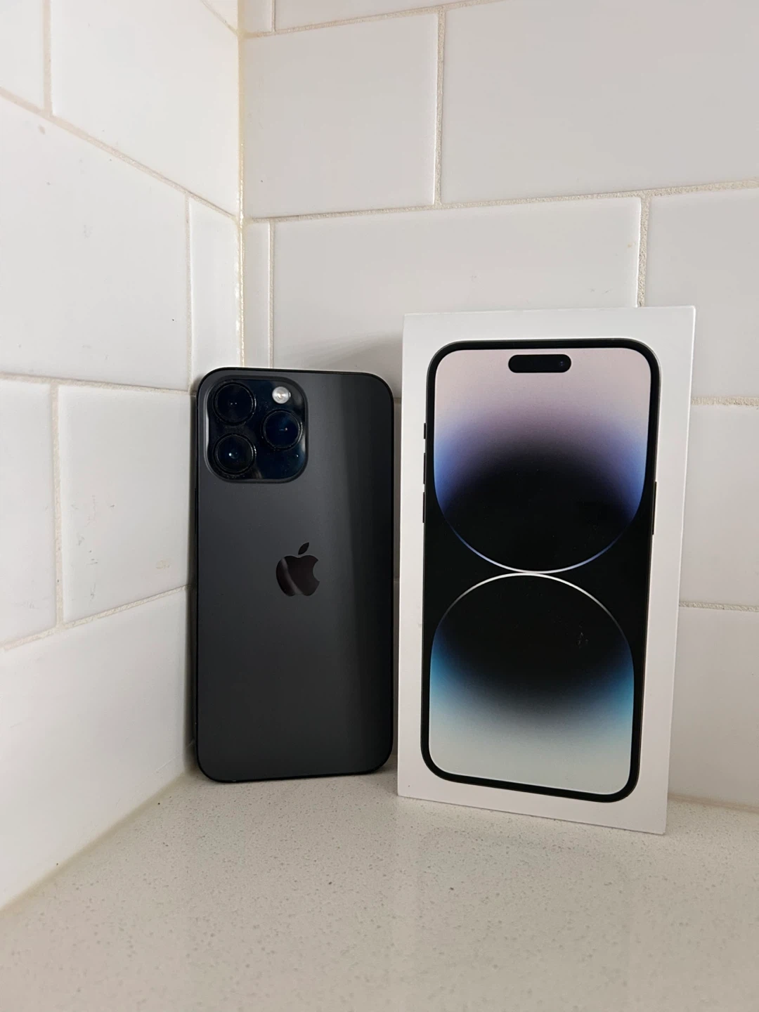 iPhone 14 Pro Max in Black color with 128GB storage. Battery health is 82%. Comes with the original box and a case. The phone is in excellent condition with no scratches, no dents, and no cracks. Fully unlocked and works perfectly. Well maintained and ready for the new owner. Price is firm.