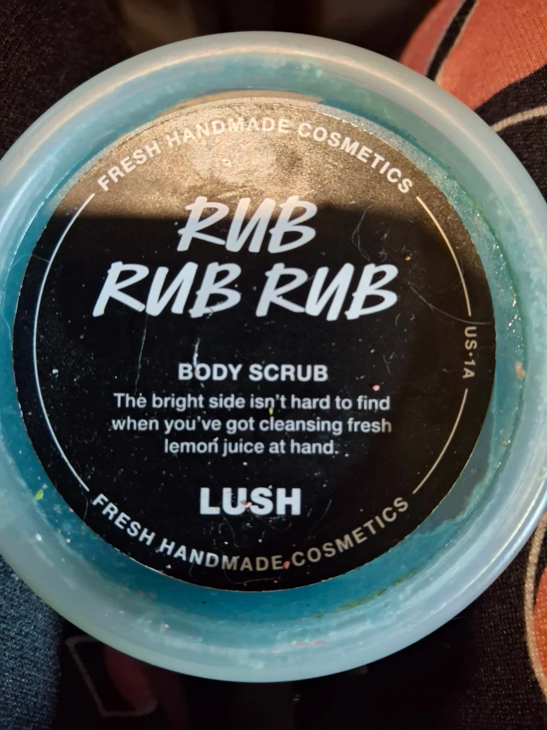 Selling a tub of Lush's Rub Rub Rub body scrub! It's a lovely sea salt-based scrub with lemon juice that leaves your skin feeling so soft and refreshed