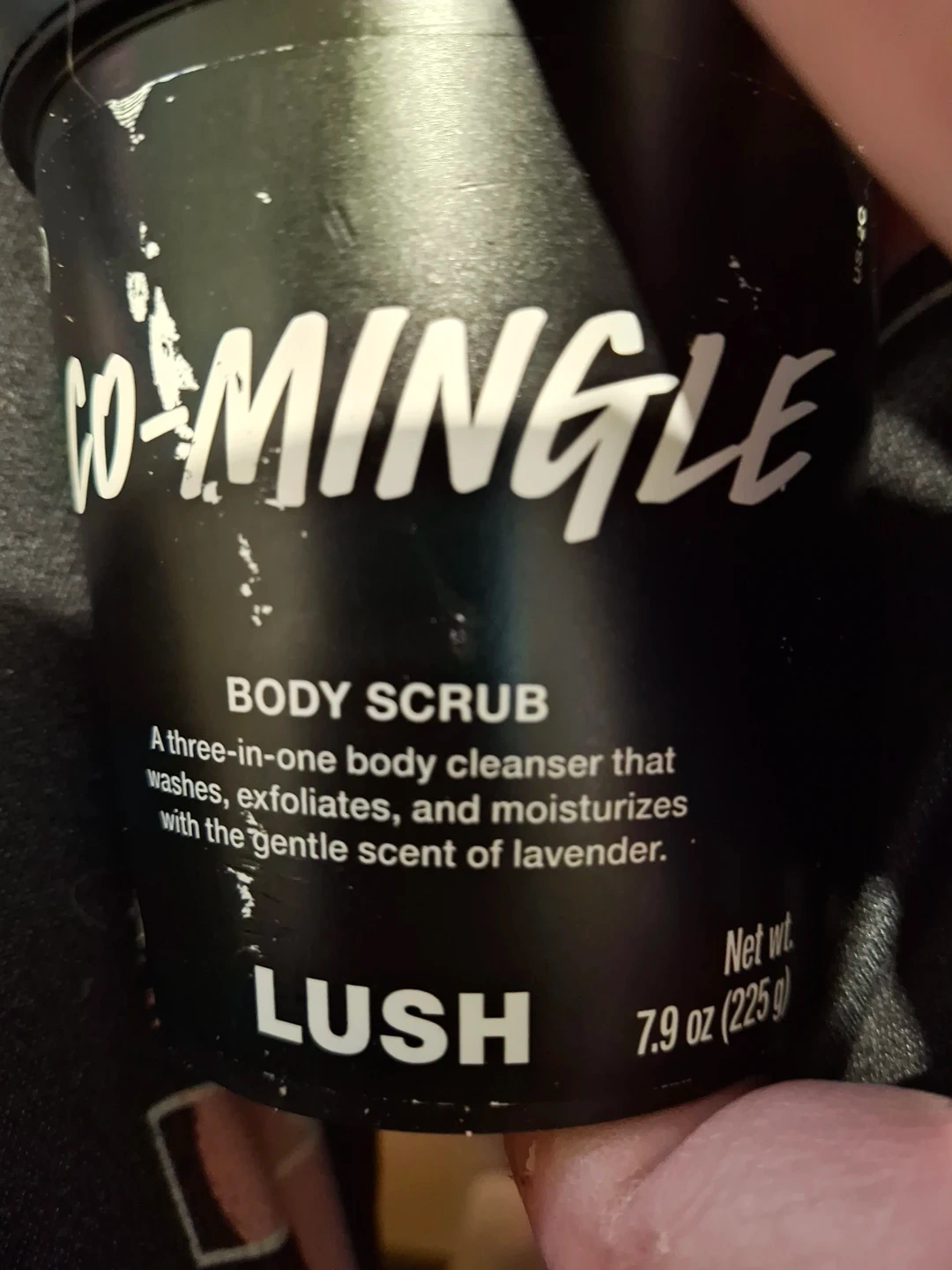 Selling a Lush Co-Mingle body scrub! It's a three-in-one body cleanser that washes, exfoliates, and moisturizes, with a gentle scent of lavender. The size is 225g. Originally bought for $32