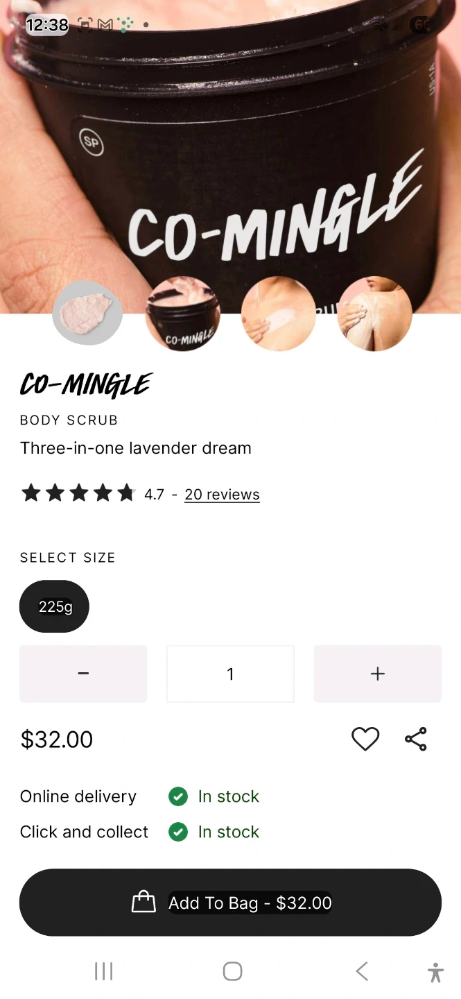 Selling a Lush Co-Mingle body scrub! It's a three-in-one body cleanser that washes, exfoliates, and moisturizes, with a gentle scent of lavender. The size is 225g. Originally bought for $32