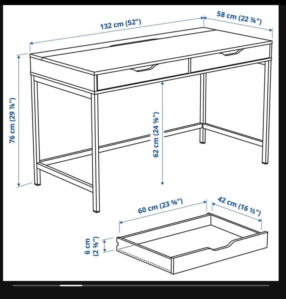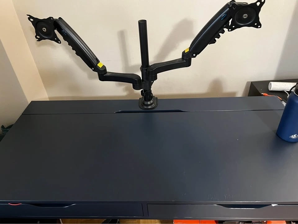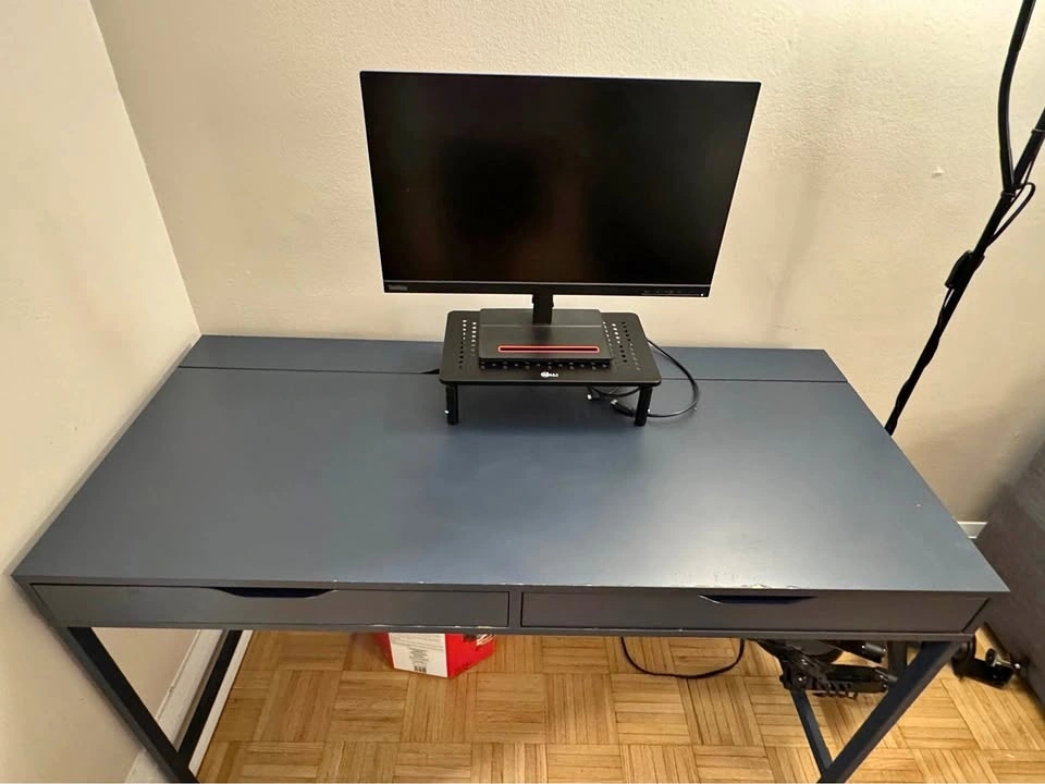 Ikea office desk with drawers. Table is solid except a few chips and a hole at the back for monitor stand assembly. Take table + monitor arm for $80. (Monitor not included)