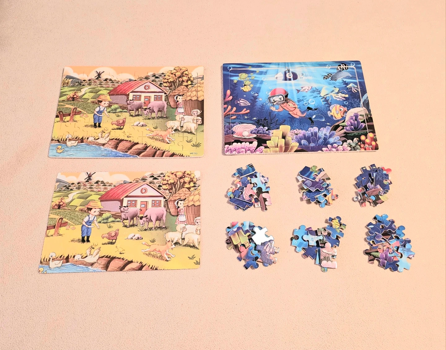 Two NEW quality wooden puzzles! One features a farm scene, and the other is an underwater adventure. Great educational fun for developing problem-solving skills and hand-eye coordination for young ones. Each puzzle 30 x 22.5cm has 60 wooden pieces, wood base frame with a printed poster of same puzzle image. $4 Each