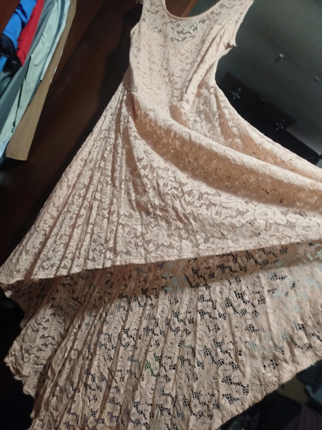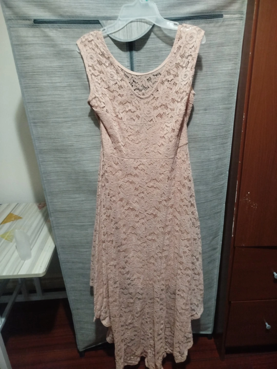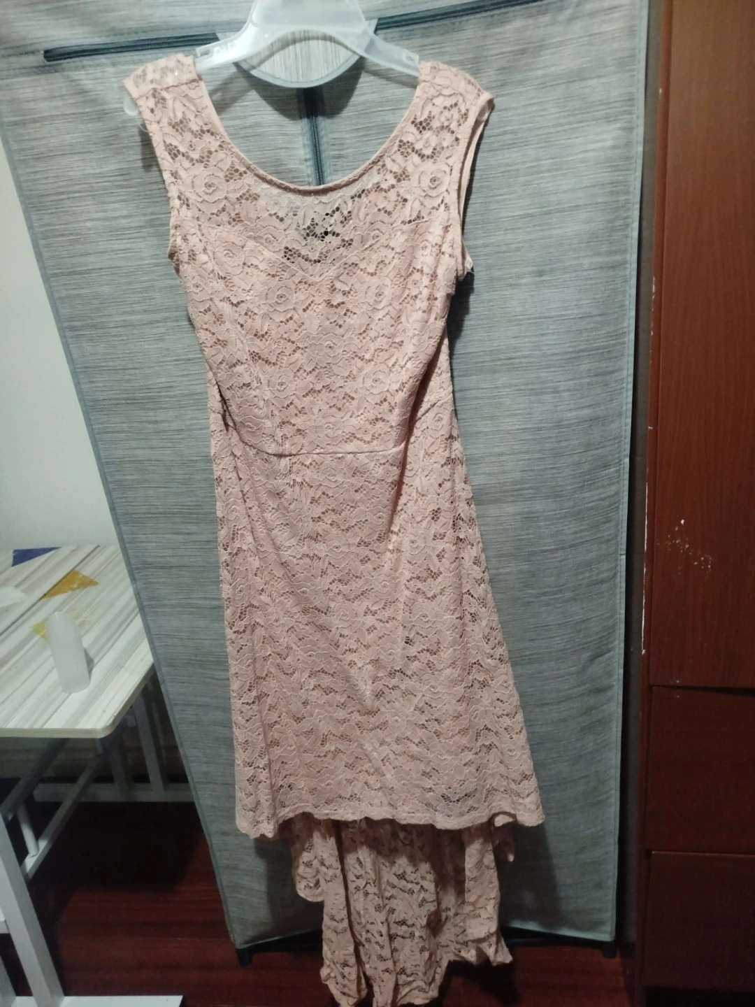 Selling a lovely lace dress in a light pink colour! It features a delicate lace pattern and a flattering silhouette. Perfect for a special occasion or a night out