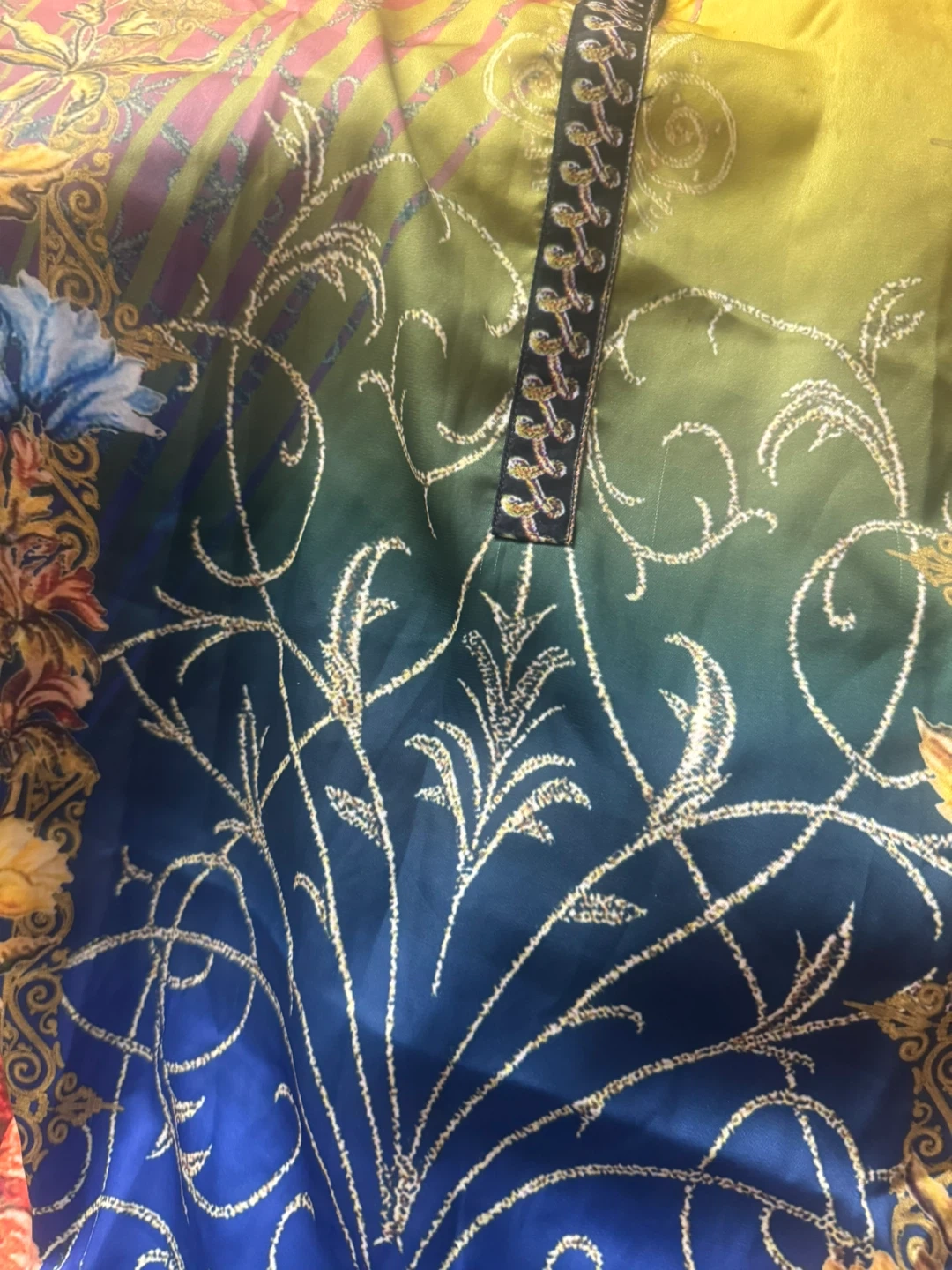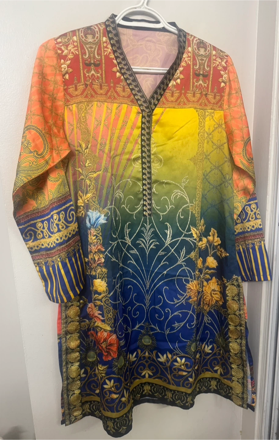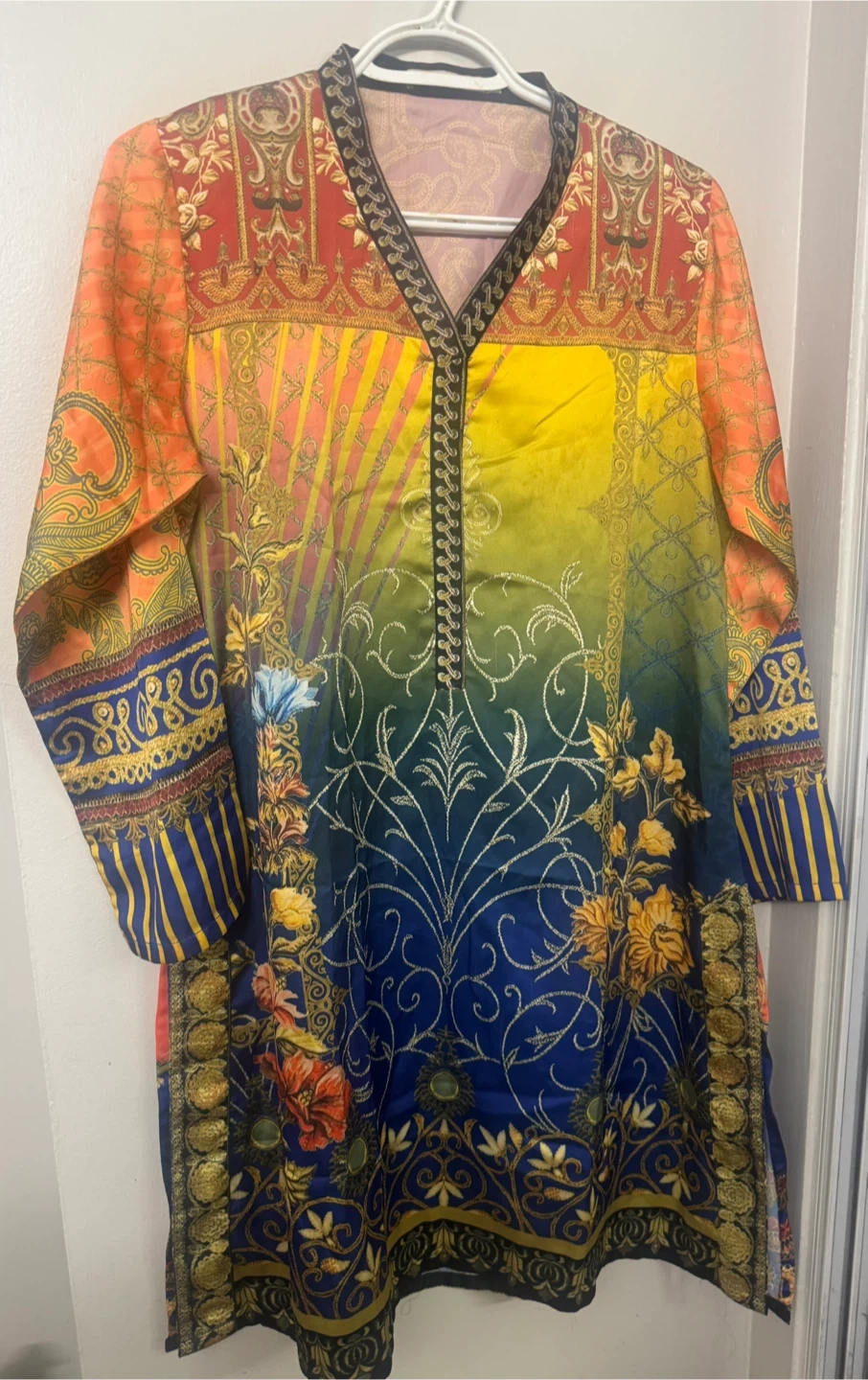 Selling a vibrant kurti with a beautiful floral print! The colours are so eye-catching, transitioning from orange and yellow at the top to green and blue at the bottom. It's in great condition and comes with matching white pants. Perfect for adding a pop of colour to your wardrobe!
