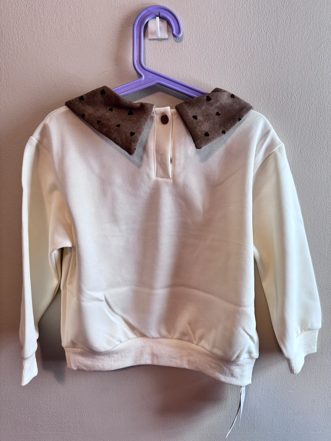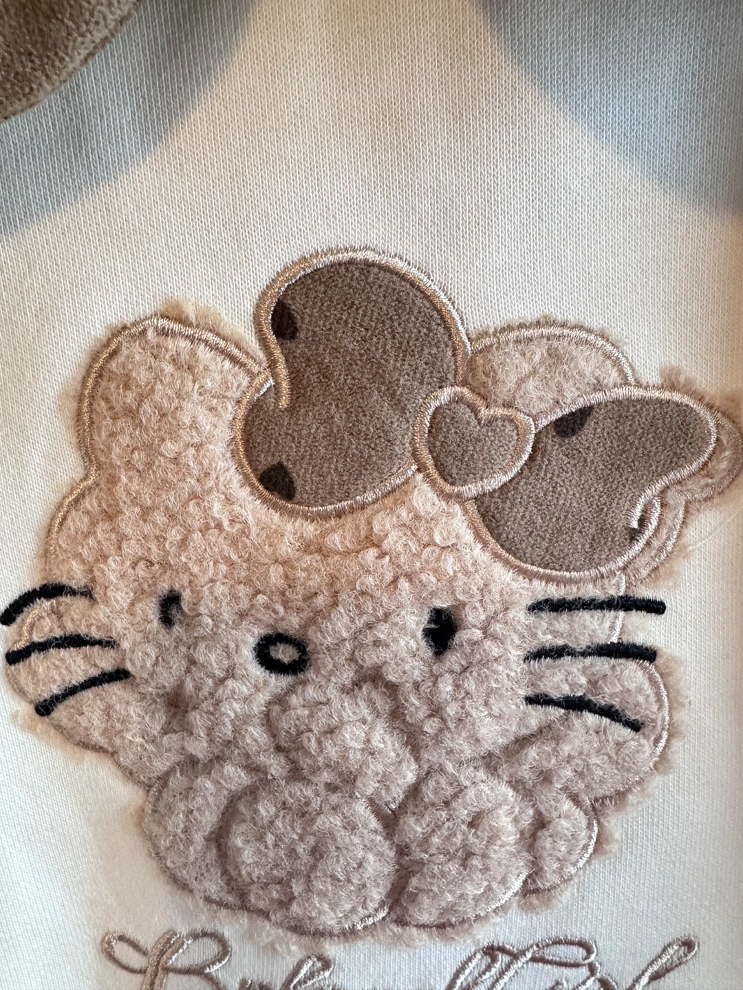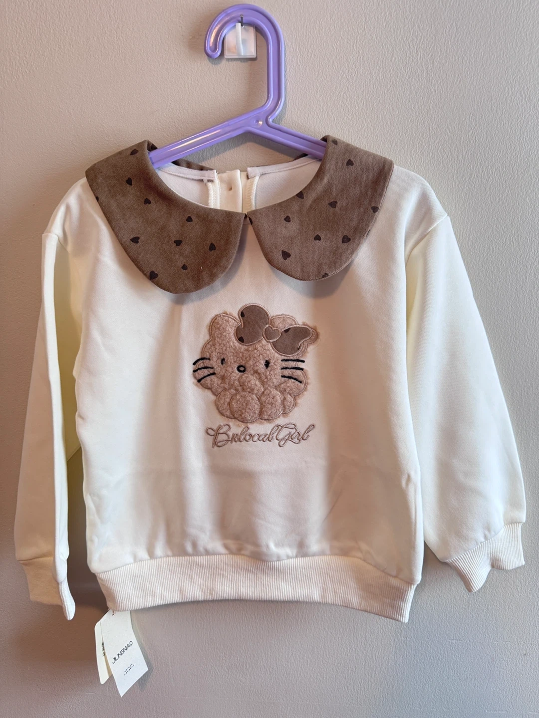 Super cute Hello Kitty sweater and skirt set! The sweater is a soft white with a brown collar and a Hello Kitty design on the front. The skirt is brown with a heart pattern. 80% cotton material.