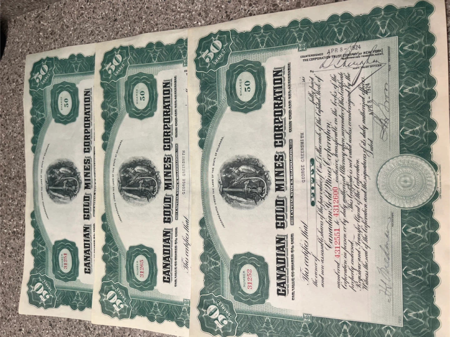 Selling three vintage Canadian Gold Mines Corporation stock certificates. Each certificate represents 50 shares. They are dated April 8, 1924, and are fully paid and non-assessable. Great for collectors or historical enthusiasts!