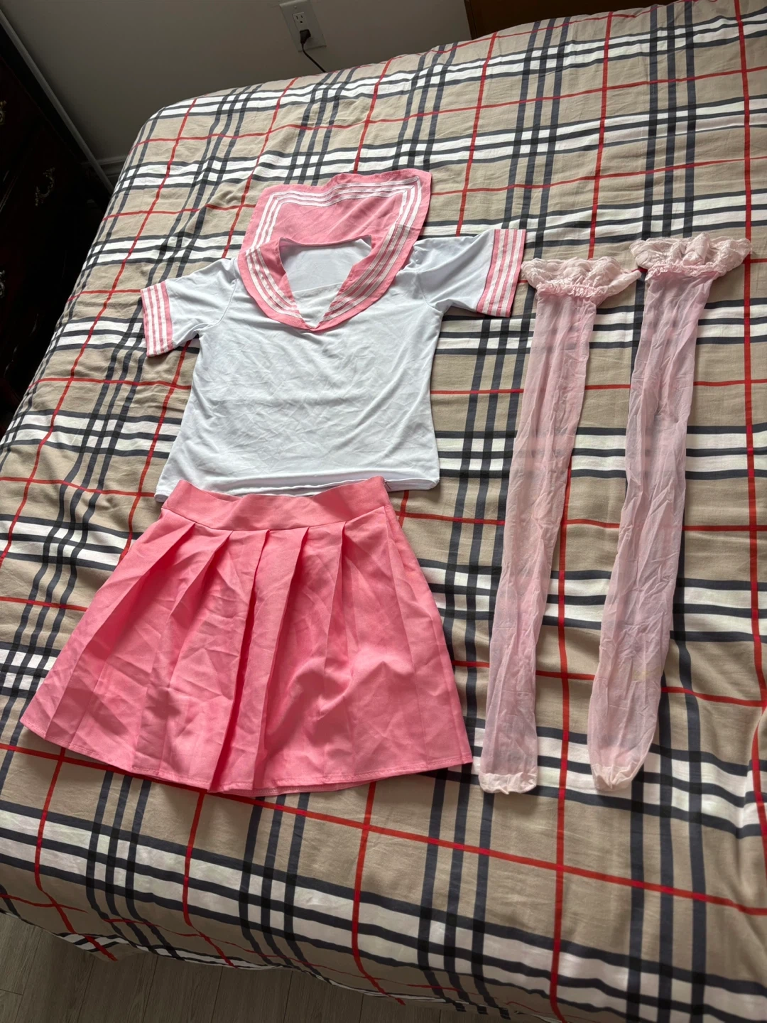 Selling a cute pink cosplay outfit! The set includes a white and pink sailor-style top, a matching pink pleated skirt, and pink thigh-high stockings. Perfect for cosplay events or just having fun!