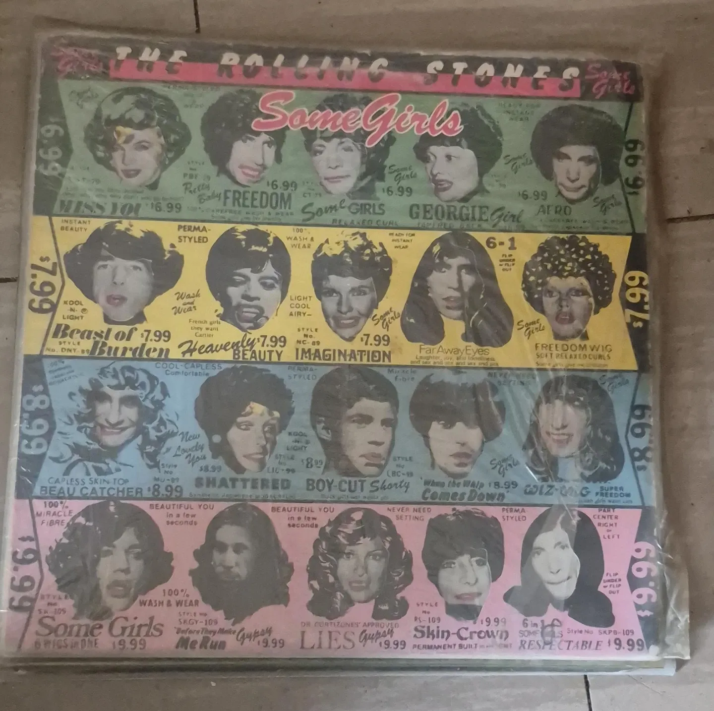 Selling a vintage vinyl record of The Rolling Stones' "Some Girls" album. The cover features a unique design with various wig styles and retro graphics. A cool piece for any music collector or Rolling Stones fan!