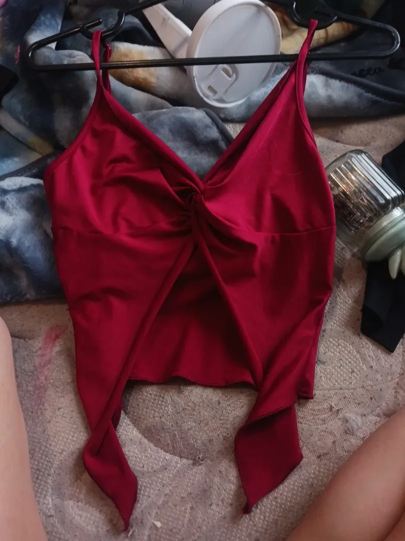 A cute red cami top is up for grabs! It features a stylish twist front and adjustable straps for a perfect fit. This top is great for layering or wearing on its own for a fun and flirty look