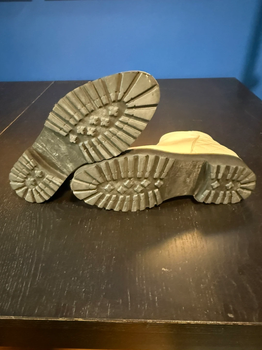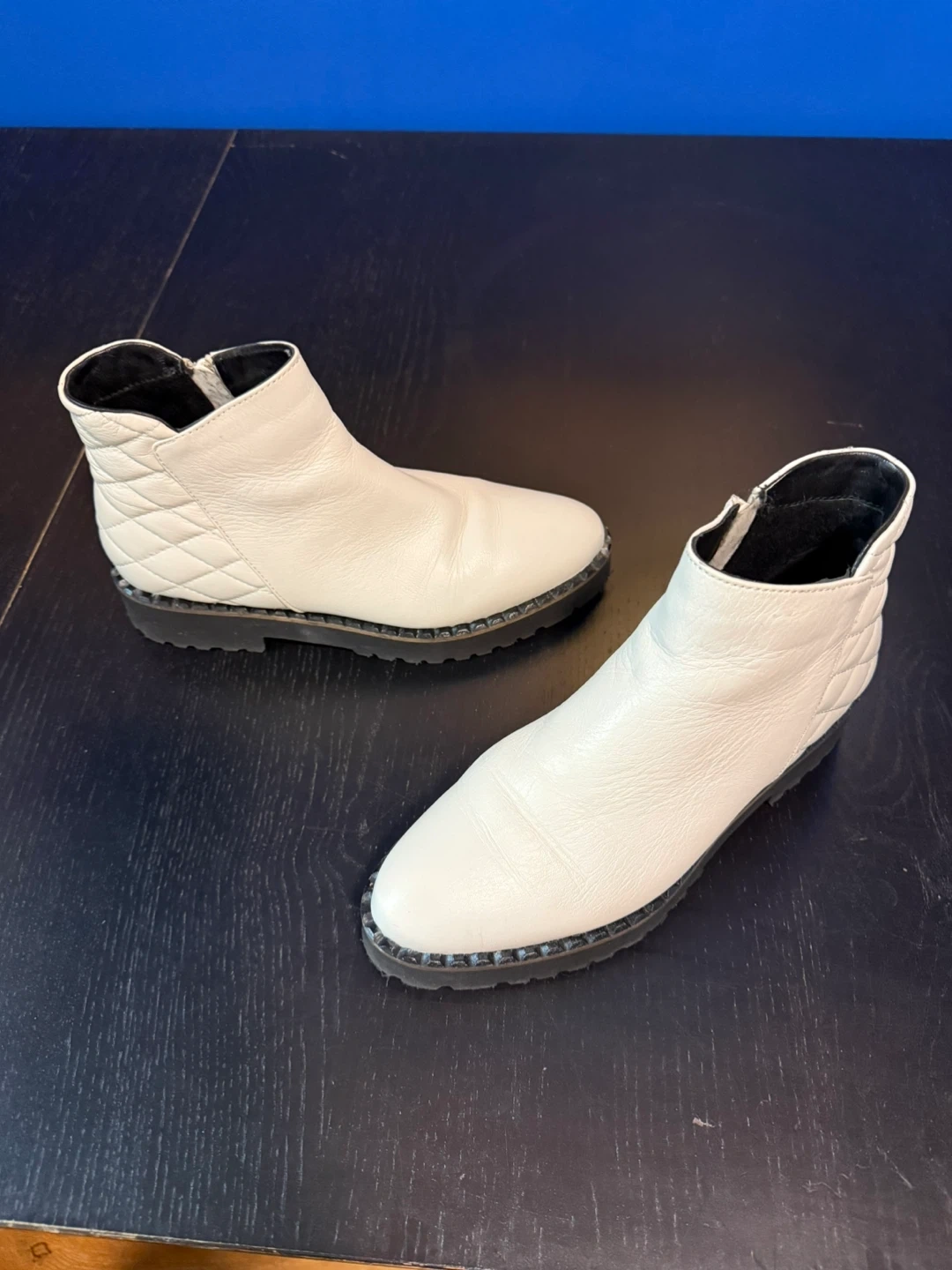Selling a pair of white faux leather ankle boots in great condition! They're a size 7 and feature a stylish quilted design on the sides. The boots have a comfortable, sturdy sole, perfect for everyday wear. They show minimal signs of wear and are ready for a new home