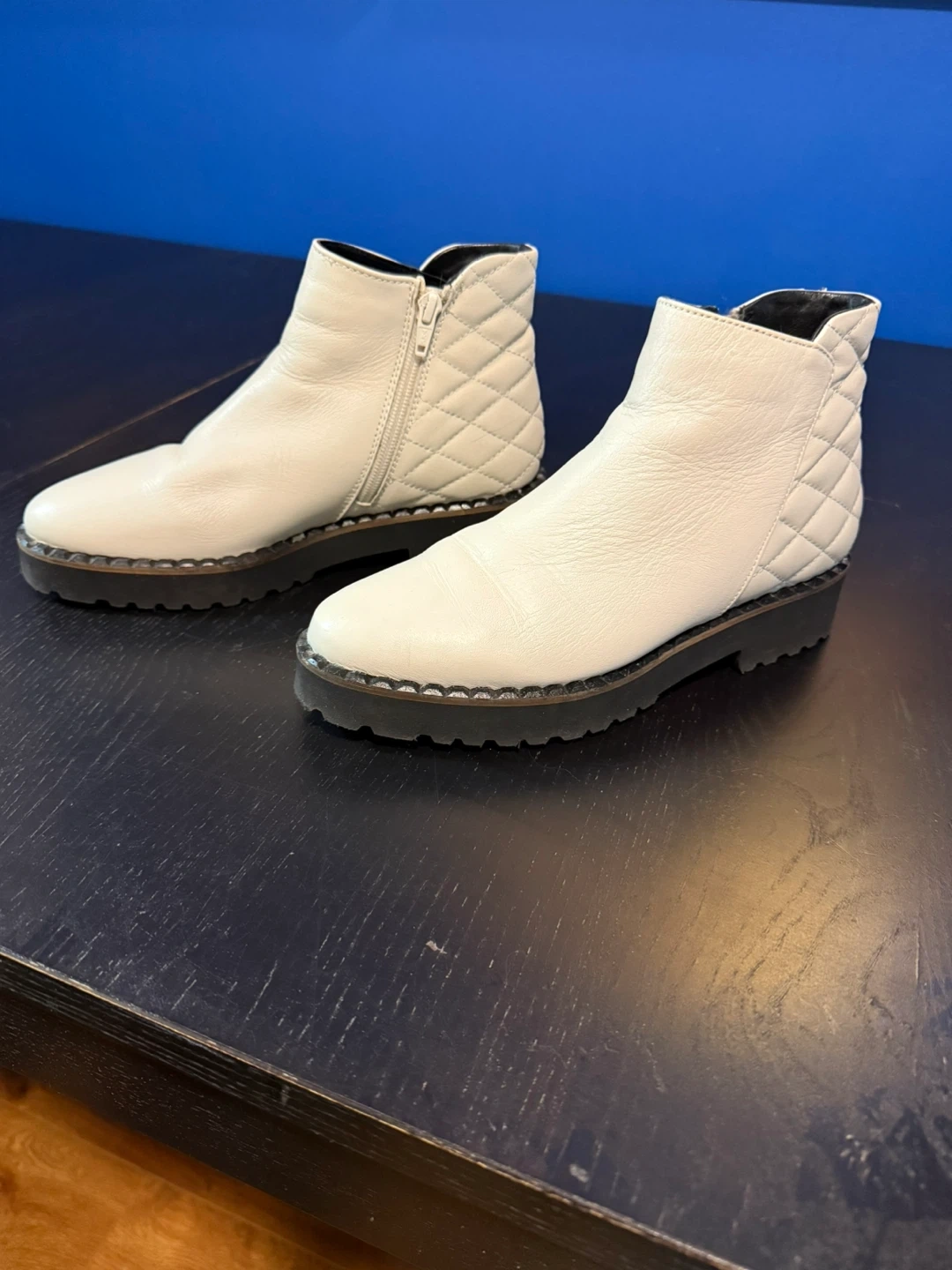 Selling a pair of white faux leather ankle boots in great condition! They're a size 7 and feature a stylish quilted design on the sides. The boots have a comfortable, sturdy sole, perfect for everyday wear. They show minimal signs of wear and are ready for a new home