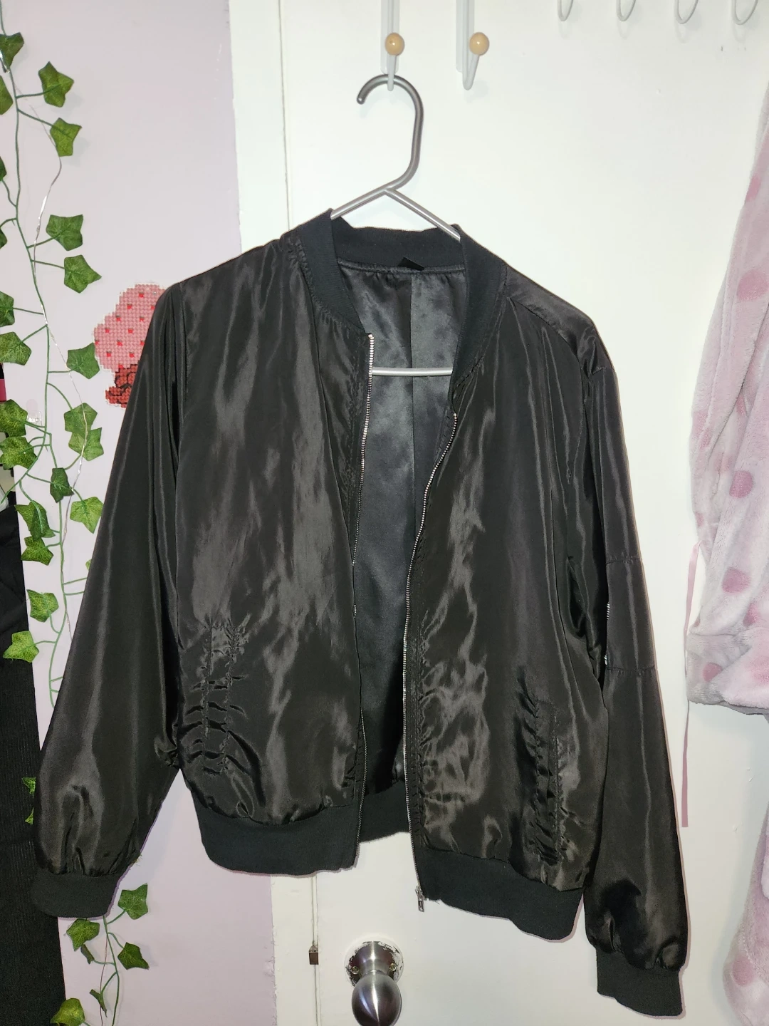 Selling a classic black bomber jacket! It's in great shape and ready for a new home. Perfect for layering or wearing on its own during those cool evenings. A versatile piece for any wardrobe!