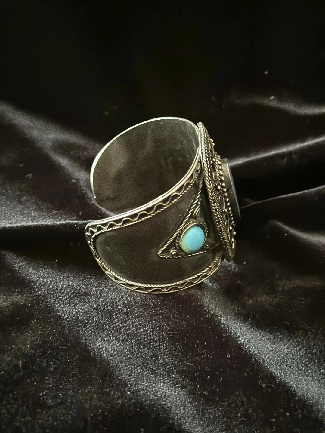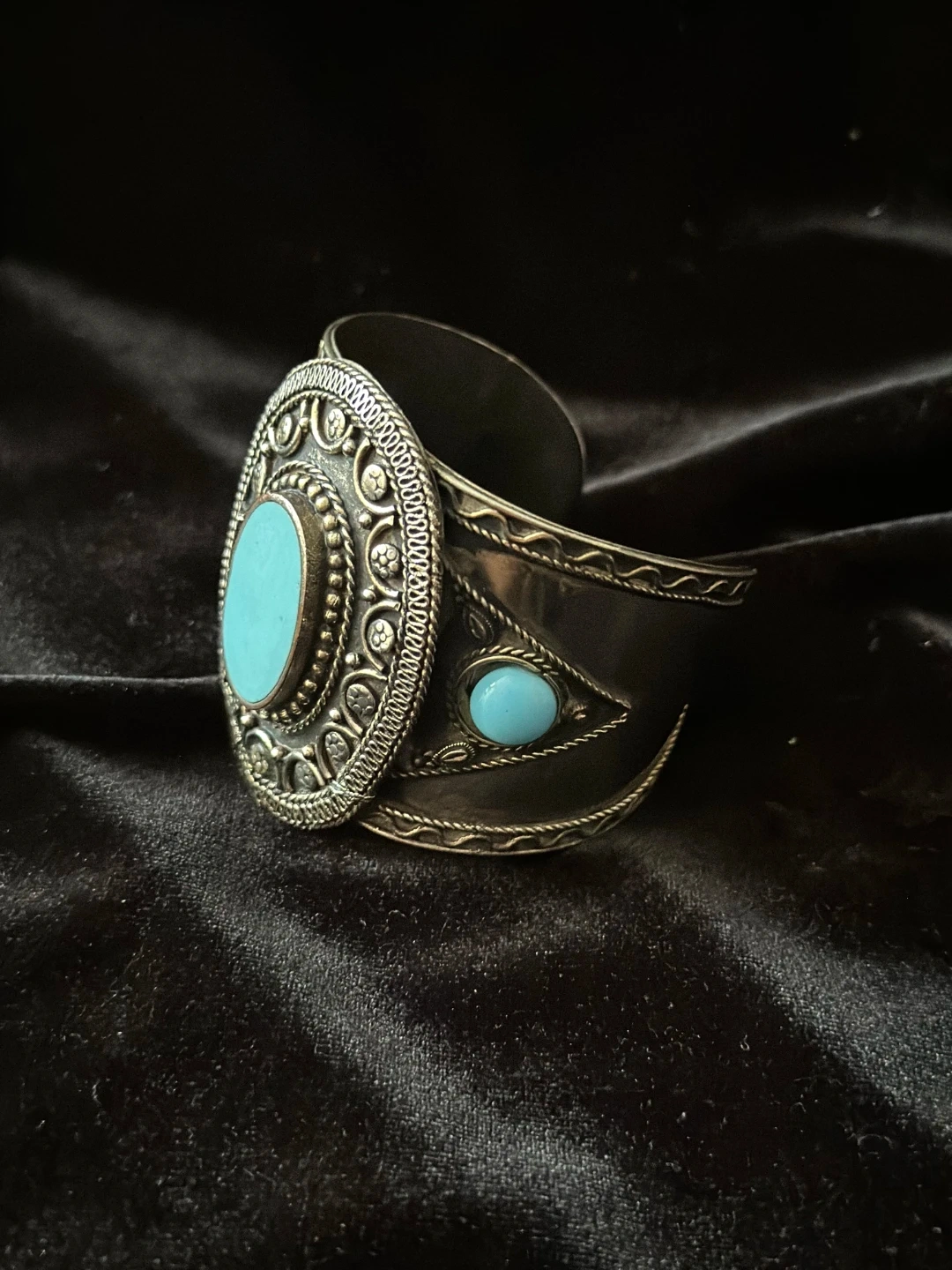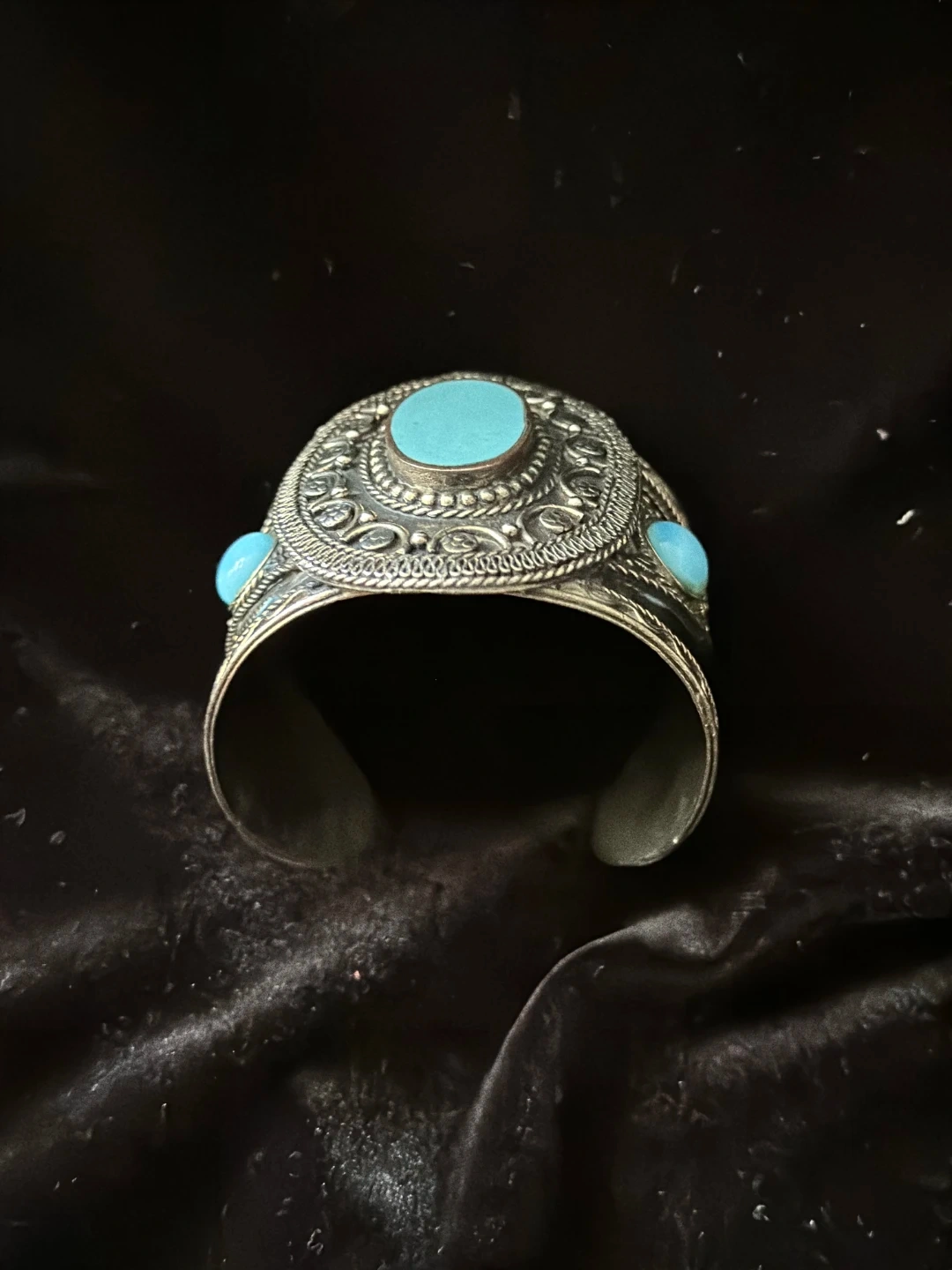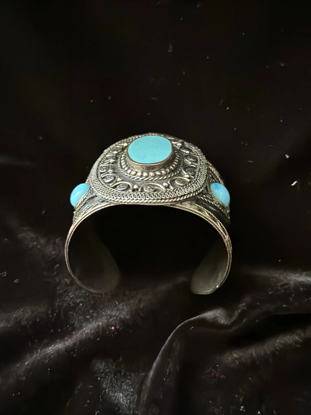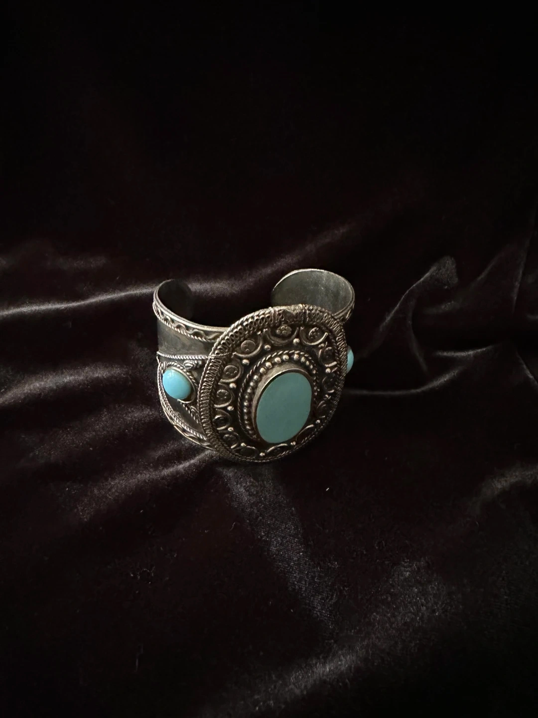 Selling a beautiful silver-tone cuff bracelet featuring turquoise colored stones. It has an intricate design and is in great condition. Perfect for adding a unique touch to any outfit!