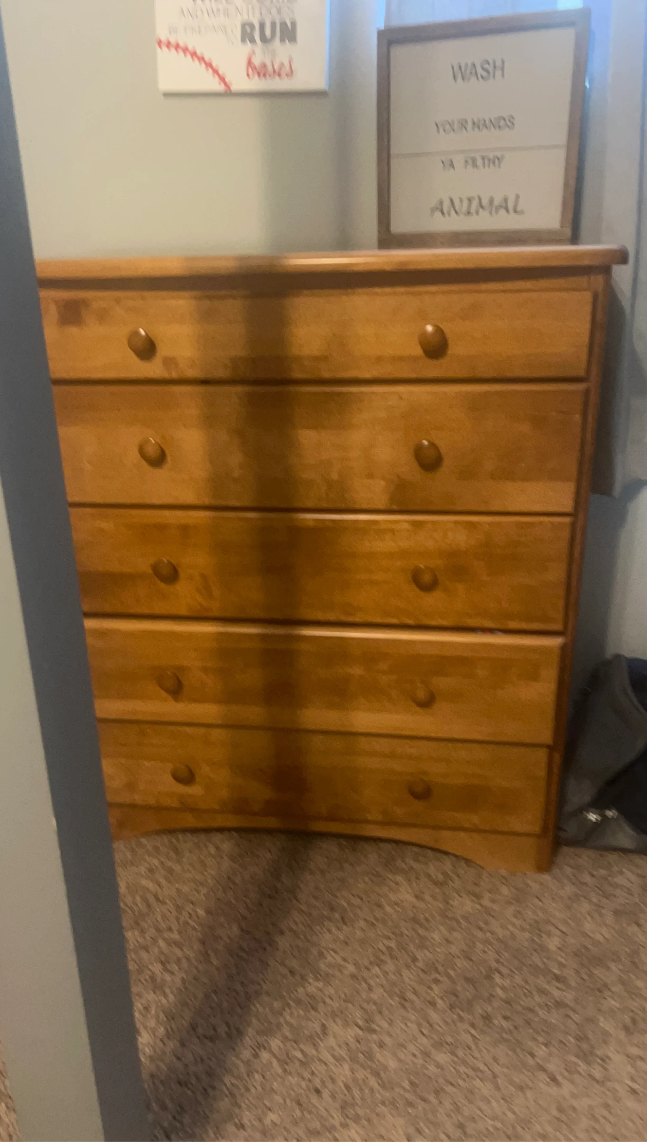 Gently used wooden dresser with five drawers. Perfect for extra storage in a bedroom or guest room. It's in good condition and ready for a new home!