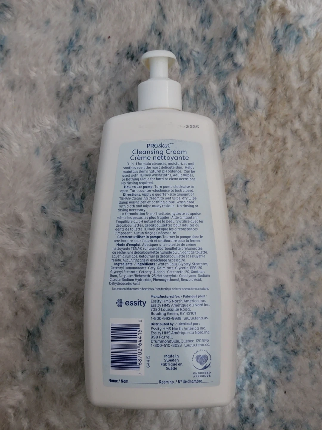 Selling a bottle of Tena Proskin Cleansing Cream. It's a fragrance-free, gentle formula designed for fragile skin. This 3-in-1 formula cleanses, moisturizes, and soothes. It comes in a 1000ml (33.8 fl oz) bottle. Made in Sweden