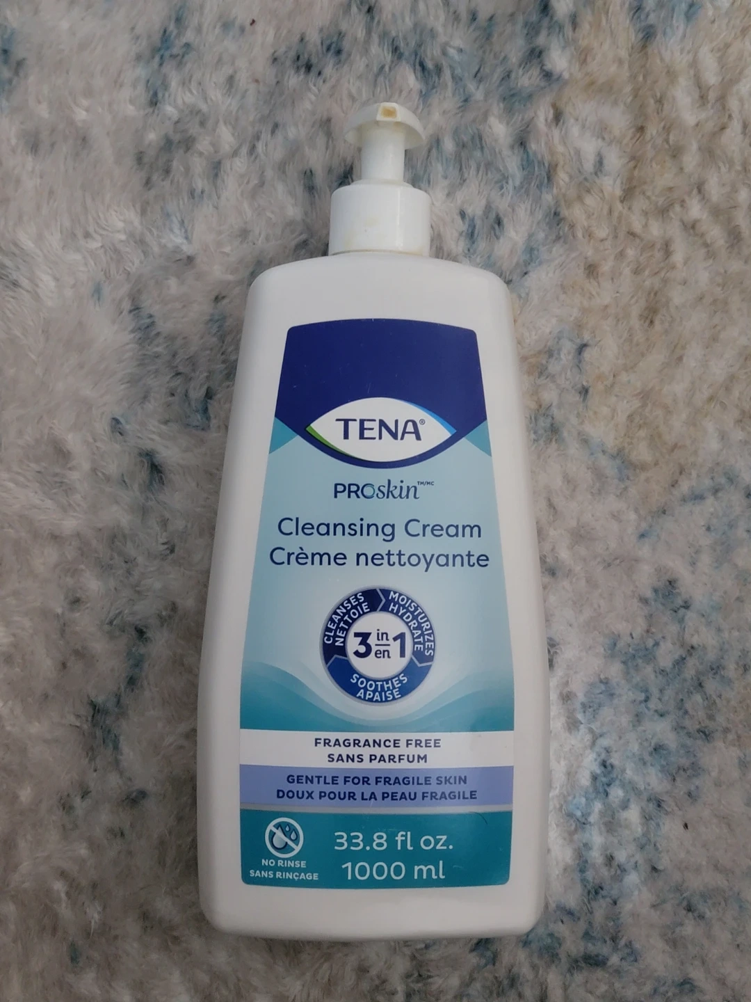 Selling a bottle of Tena Proskin Cleansing Cream. It's a fragrance-free, gentle formula designed for fragile skin. This 3-in-1 formula cleanses, moisturizes, and soothes. It comes in a 1000ml (33.8 fl oz) bottle. Made in Sweden