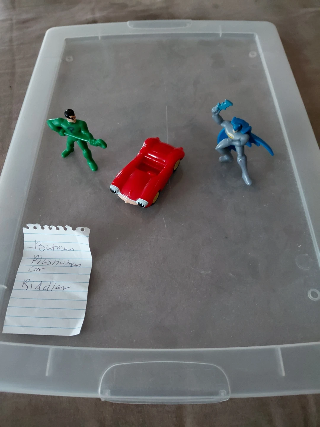 Selling a set of Batman, Robin, and Riddler figures, plus a plasticman car! Great for a collector or for play 2011
