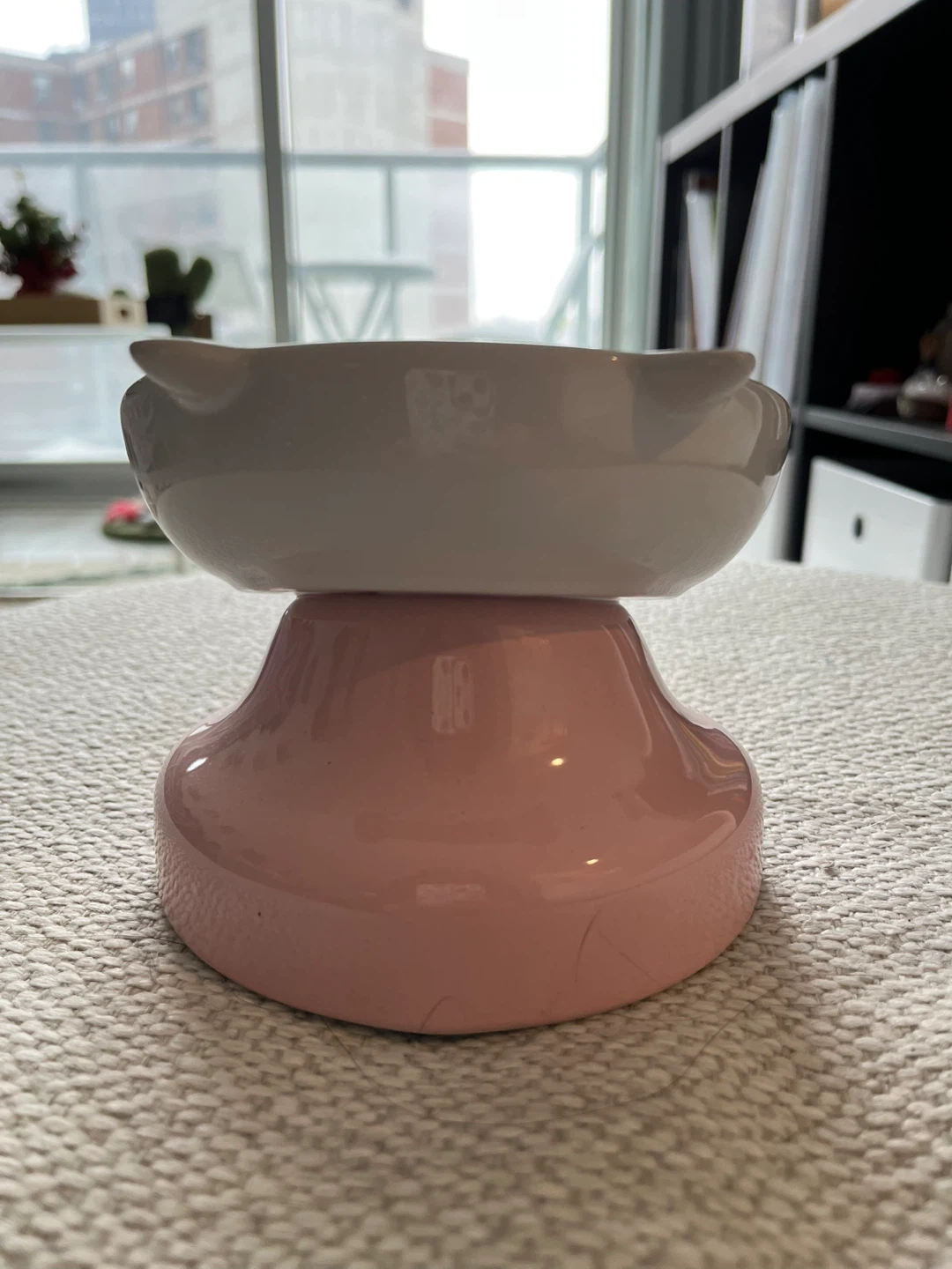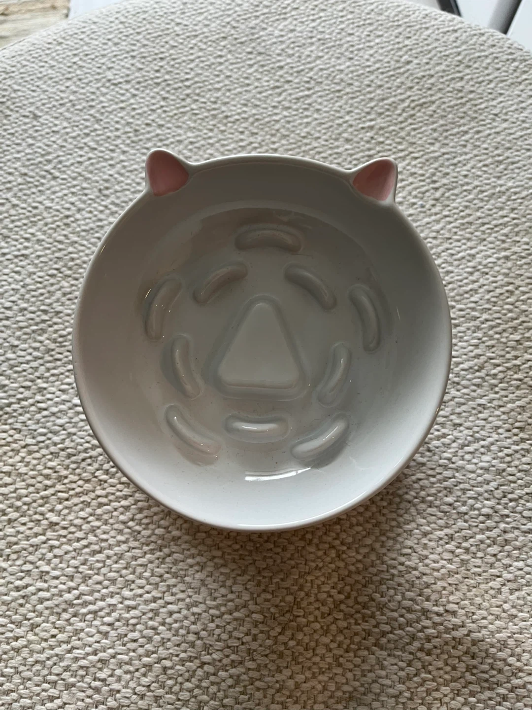 Selling a slow feeder cat bowl! It's white on top with pink accents and a pink base. The bottom has the YHY logo and says "Fine Porcelain, Dishwasher Safe & Microwave Safe". It's perfect for slowing down fast eaters.