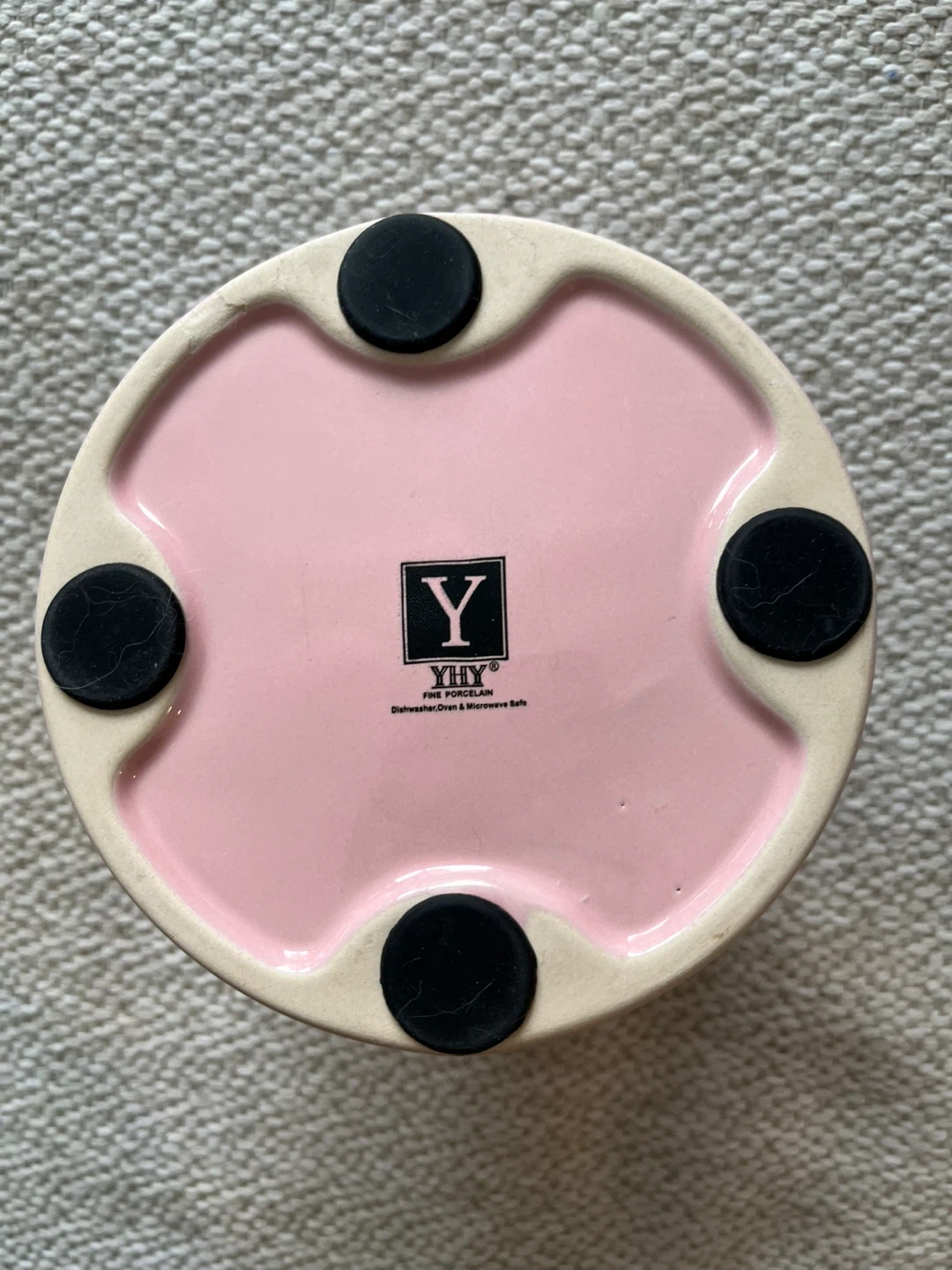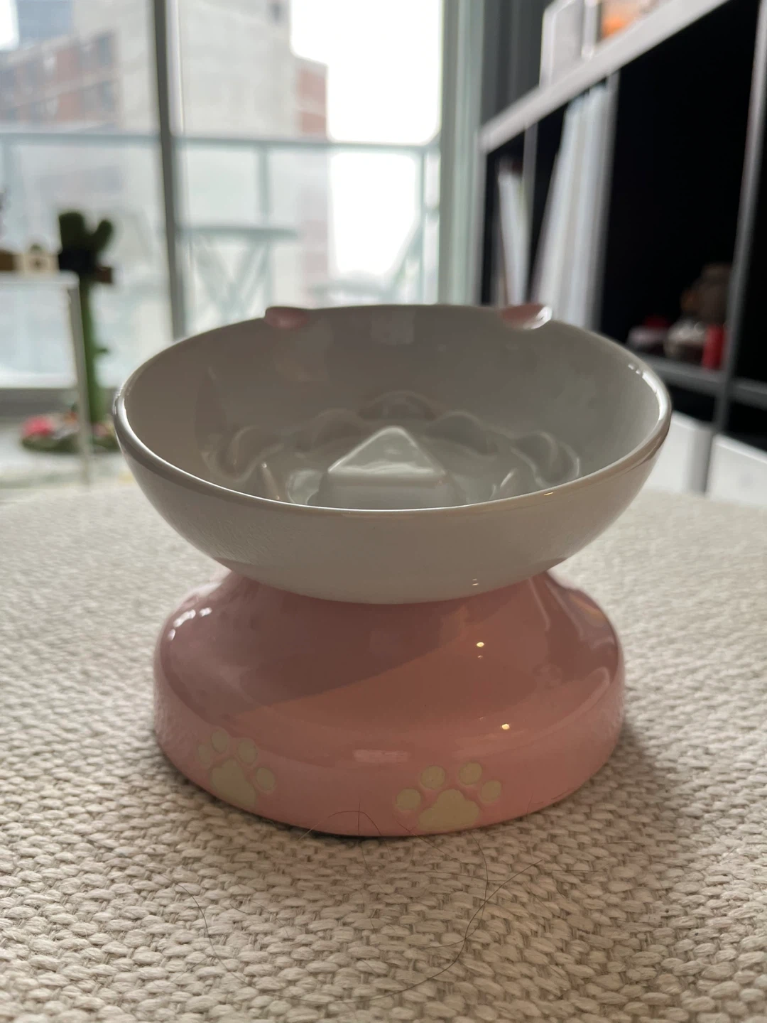Selling a slow feeder cat bowl! It's white on top with pink accents and a pink base. The bottom has the YHY logo and says "Fine Porcelain, Dishwasher Safe & Microwave Safe". It's perfect for slowing down fast eaters.