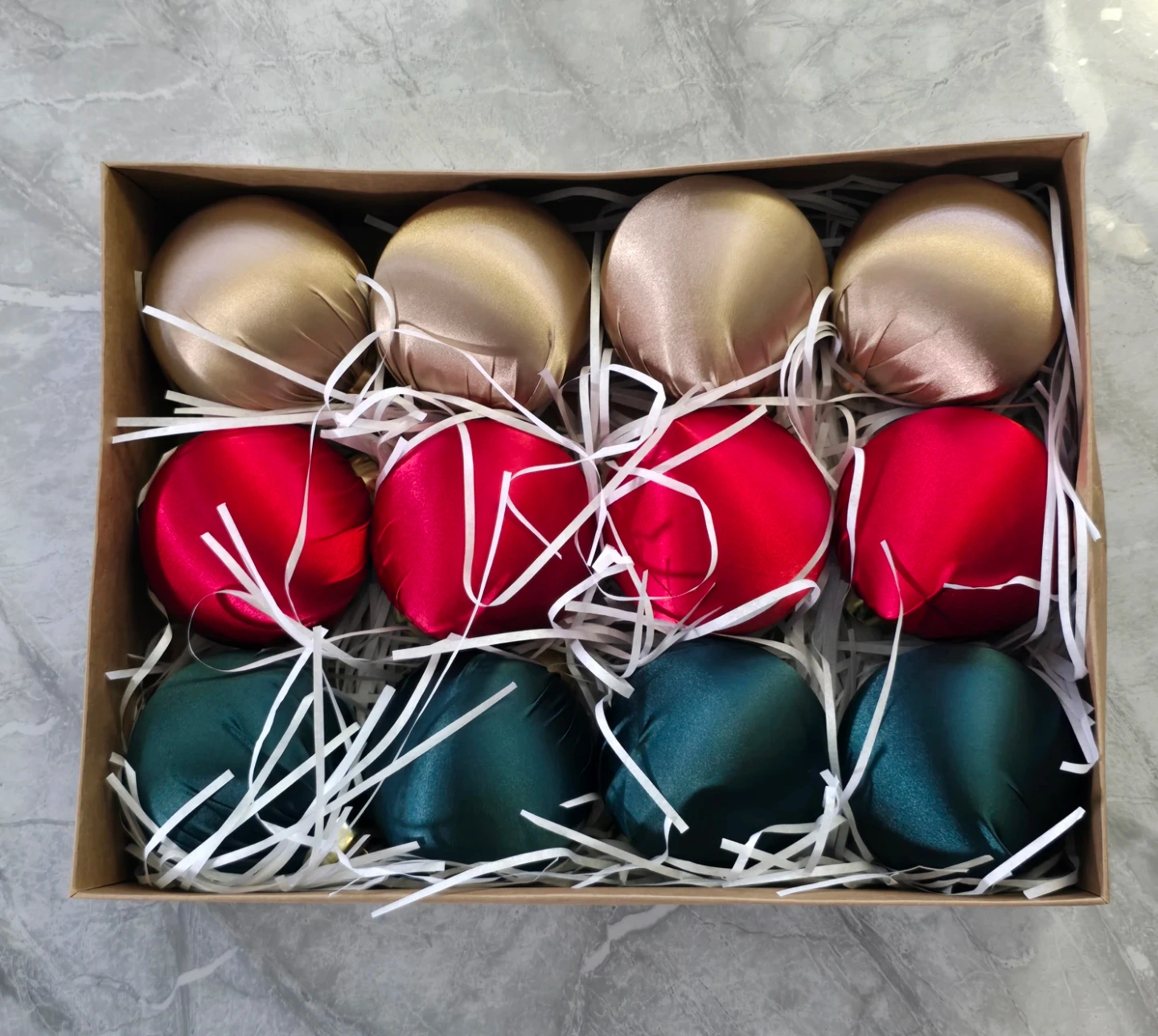 3" simgoing 12 pcs satin christmas decoration (red, green, champagne gold