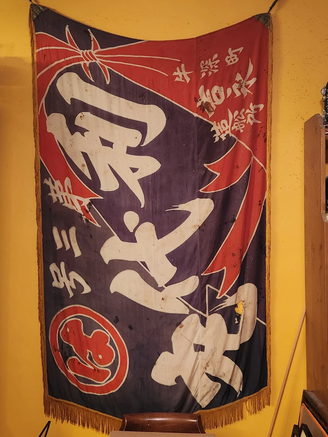 This is a vintage Japanese banner with some wear and tear, as seen in the photos. It has Japanese characters and a red and blue design. It's big.