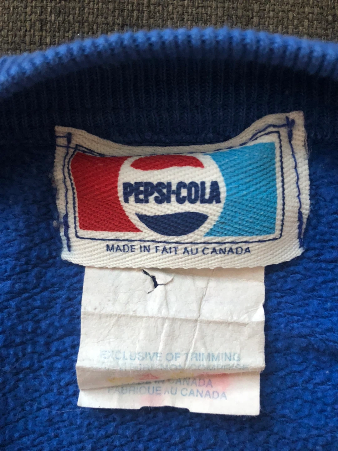 • The Logo: The sweatshirt features the classic "Pepsi-Cola" script, but the tag tells the real story. It uses the "Pepsi Globe" (the red, white, and blue circle) with parallel horizontal lines. This specific "striped" version of the globe was introduced in the mid-80s and was standard until the logo was refreshed in 1991.