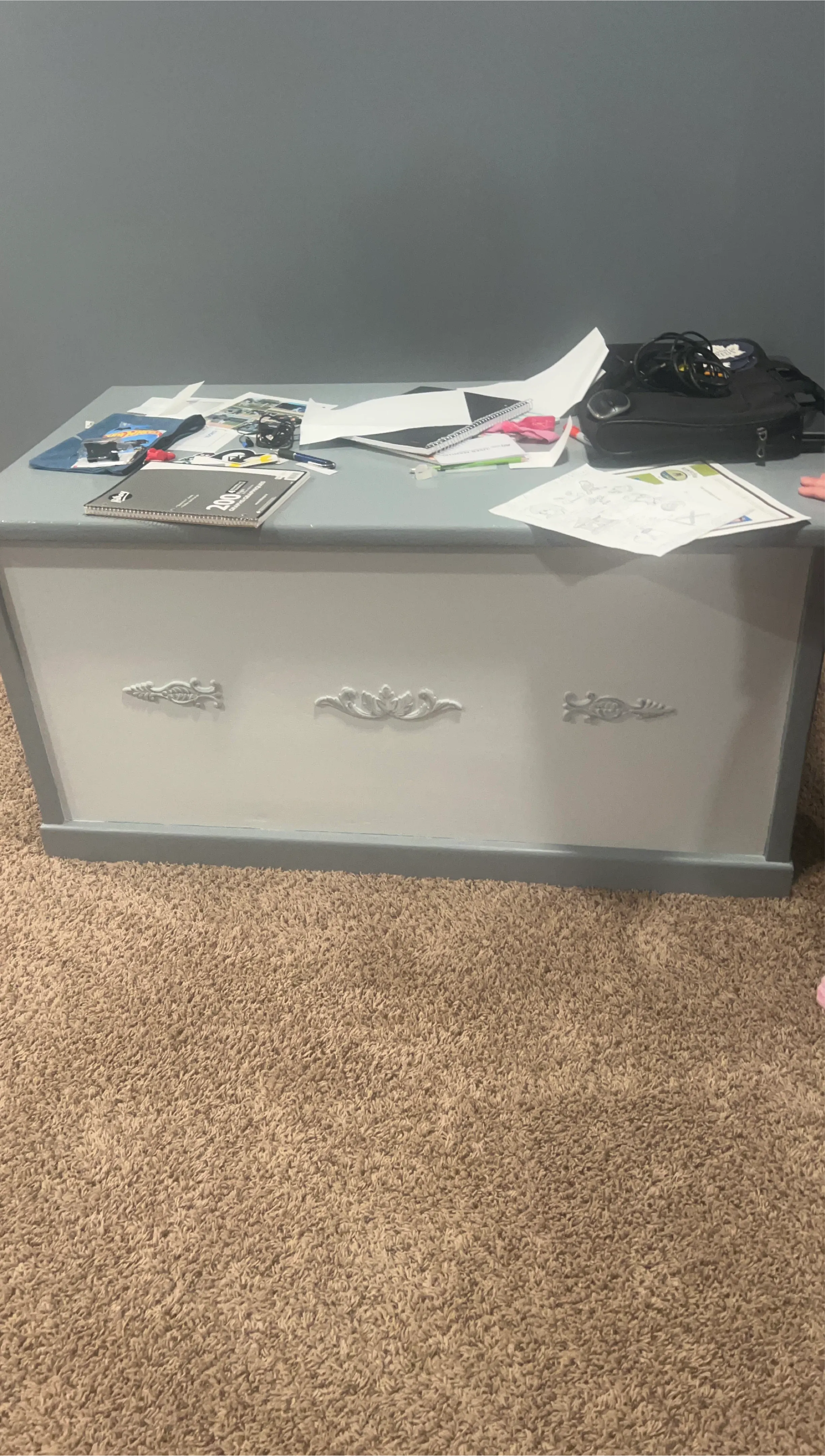 Selling a grey and white toy box. It's in great shape and has a nice, classic look with the decorative details on the front. It would be perfect for storing toys or blankets in a kids' room or playroom