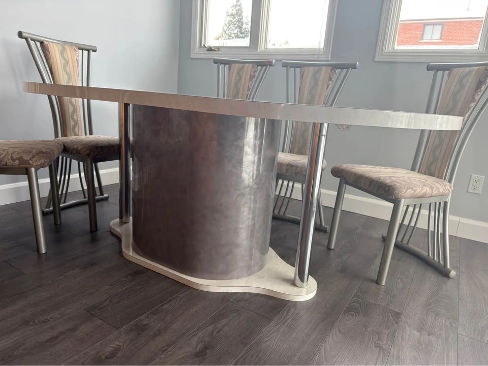 Stylish, modern, and very sophisticated dining table with 6 matching chairs. A classy, elegant design that fits perfectly in many types of homes and interiors. Solid, well-maintained, and in excellent condition. Pickup only. House moving sale.