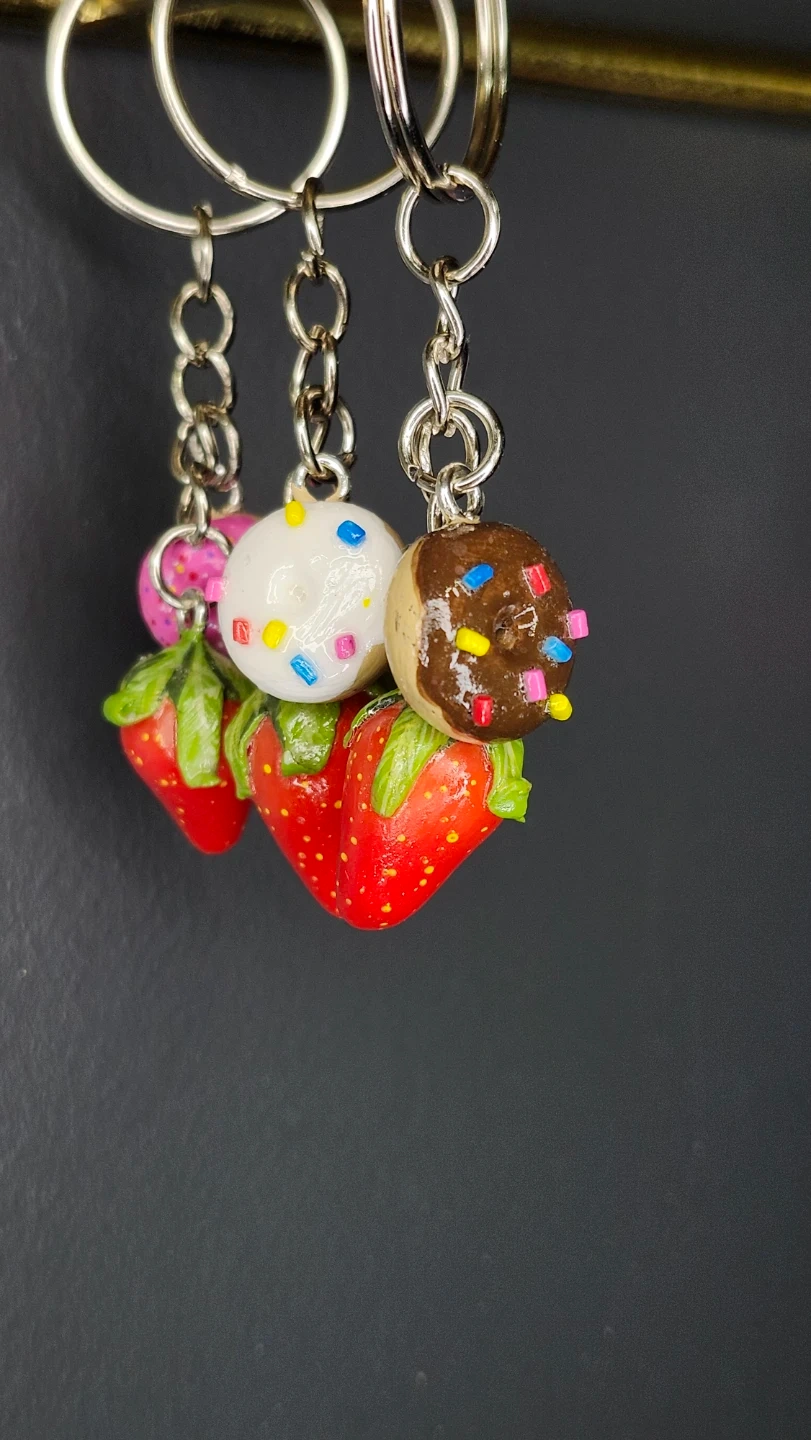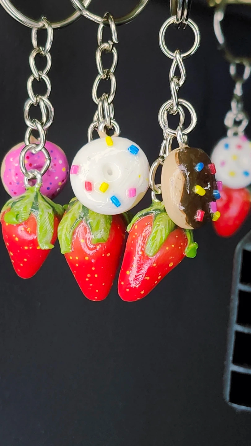 I'm selling these adorable handmade keychains! They feature a cute strawberry and donut design. Perfect for adding a sweet touch to your keys or bag!✨️💕