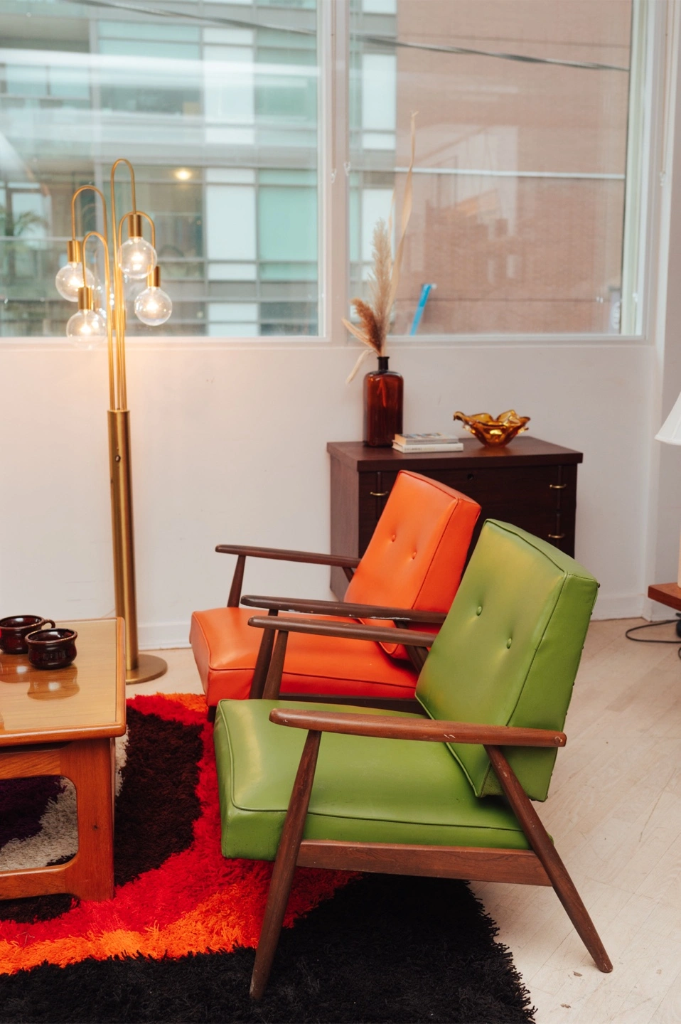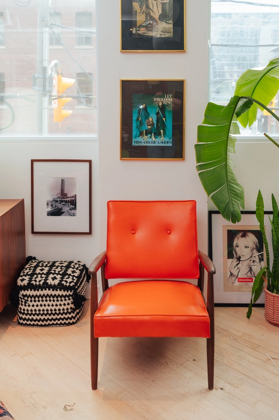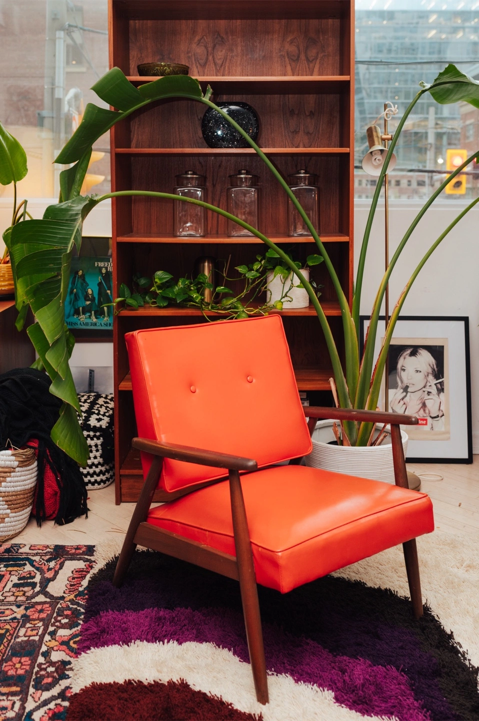 A punchy, true mid-century lounge chair with a classic low profile and sculptural wood frame. Upholstered in vibrant orange vinyl with subtle button detailing, this piece brings instant warmth and personality to any space.