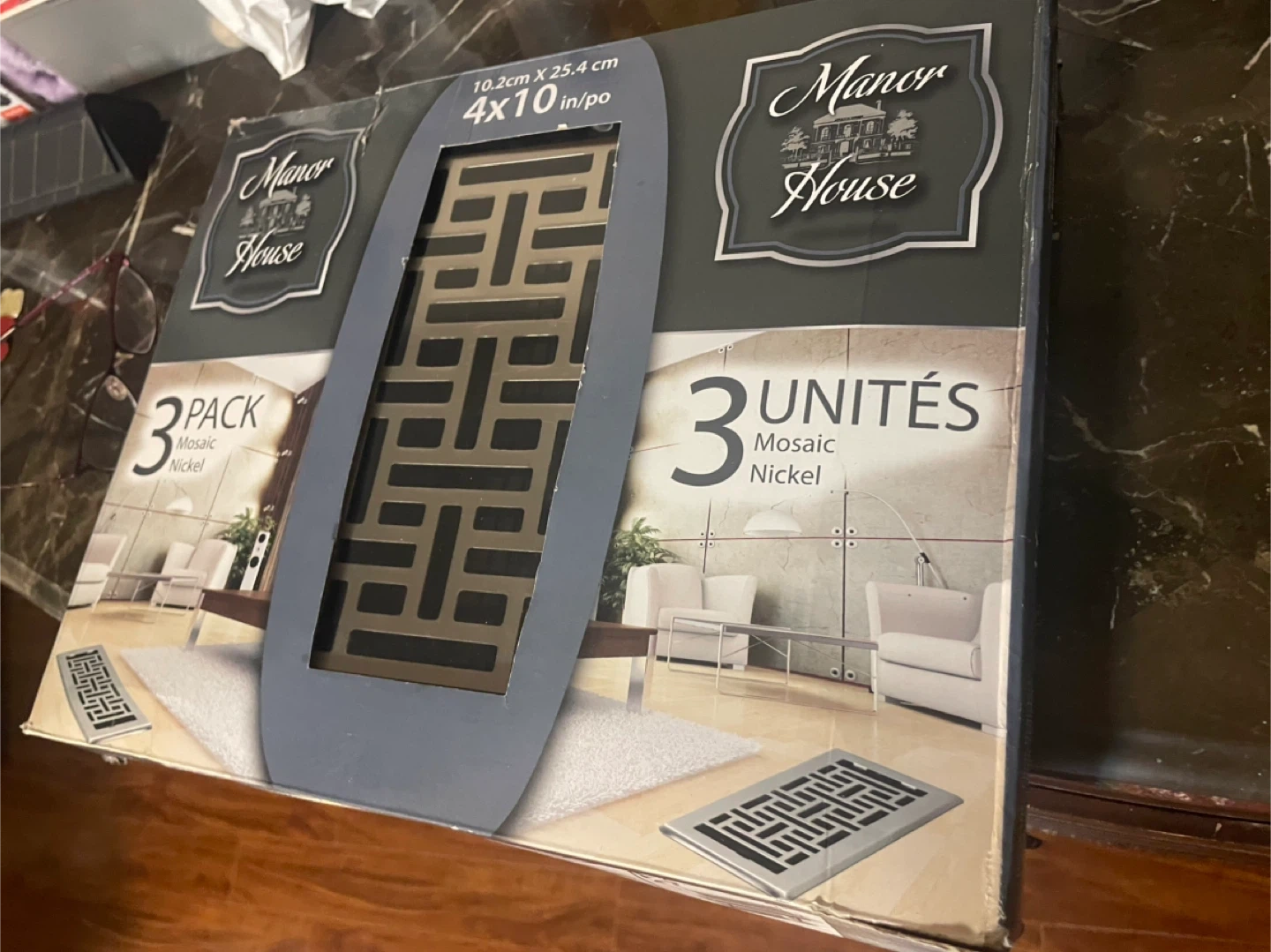 Selling a brand new, in-box 3-pack of Manor House mosaic nickel vent covers! Each vent cover measures 4x10 inches (10.2cm x 25.4cm).