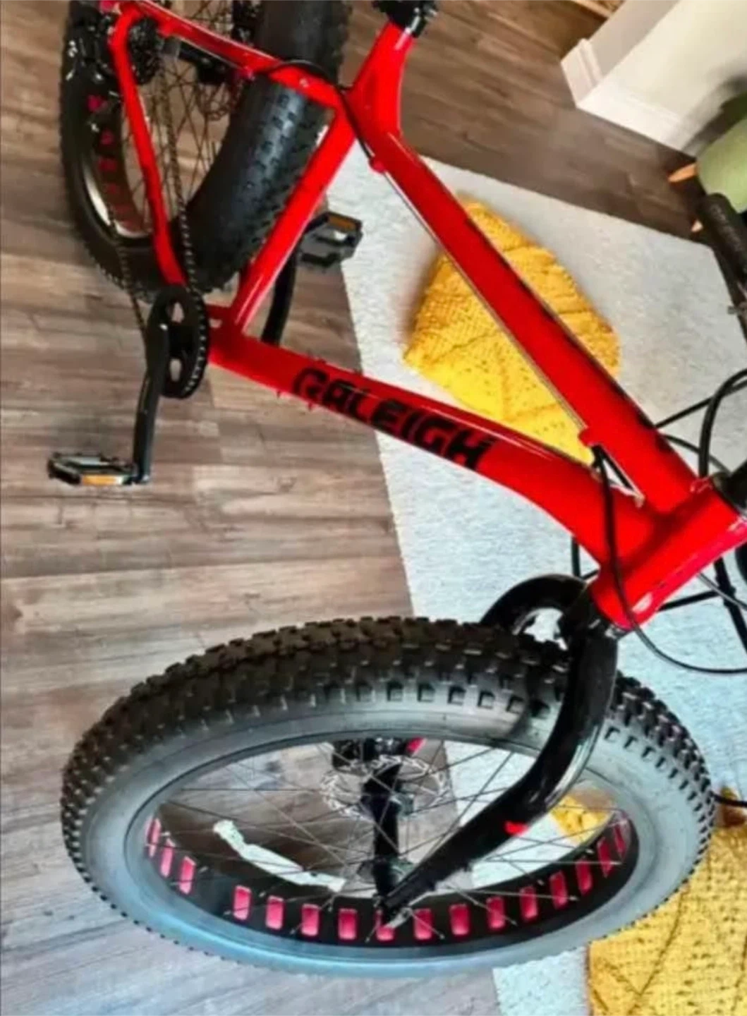 Selling a Raleigh Rogue fat tire hardtail mountain bike in red. It's a 26-inch bike