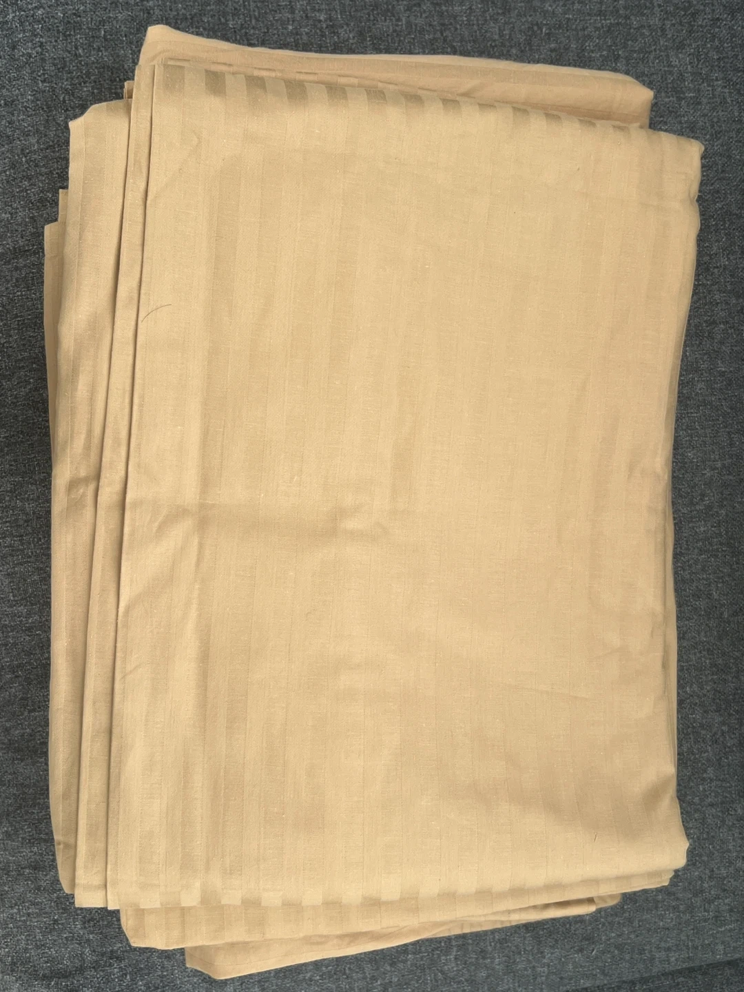 I'm selling a brand new bed sheet set in a lovely tan colour with a subtle striped pattern.