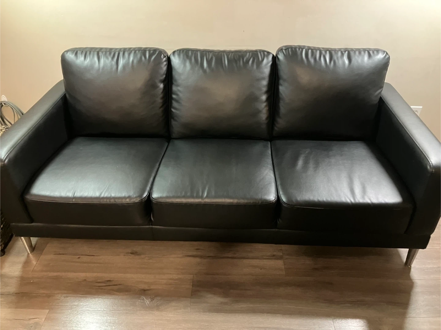 Selling a comfy black leather sofa! It's a three-seater and in excellent condition. Perfect for a living room or den. The sleek design and leather material give it a modern look. Let me know if you're interested!
