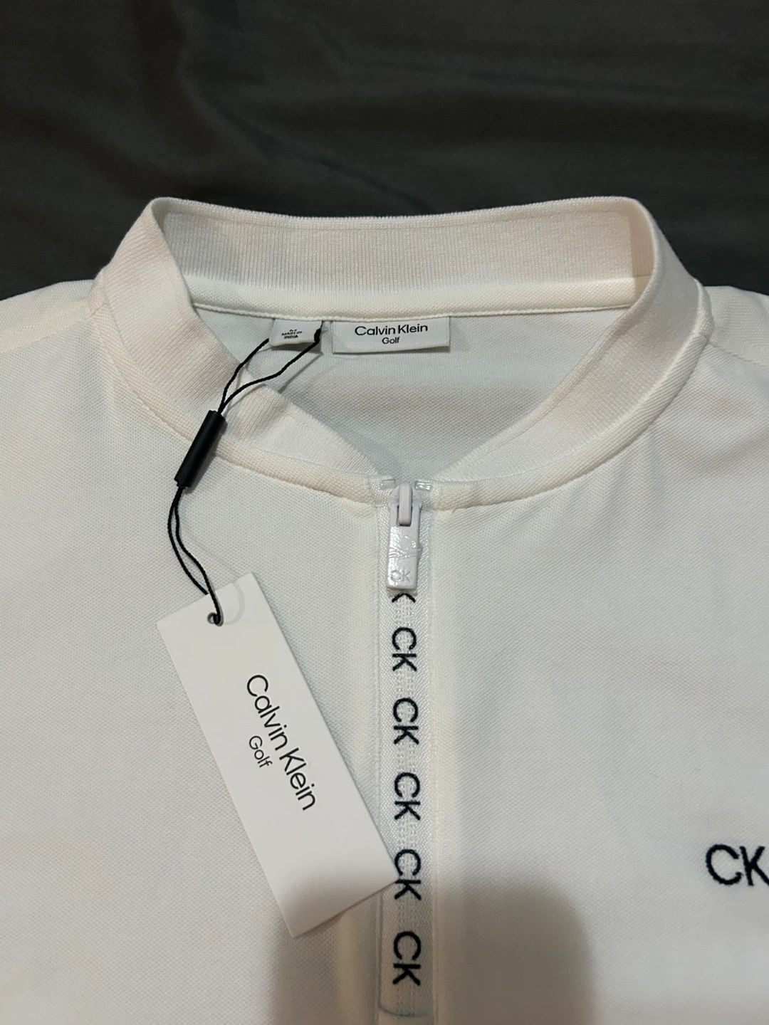Selling a Calvin Klein Golf polo shirt in white! The shirt features a unique zipper design with the CK logo. Perfect for a day on the golf course or a casual outing