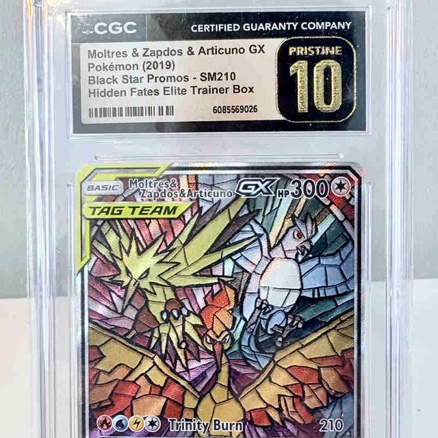 Selling a CGC pristine 10 Moltres & Zapdos & Articuno GX Black Star Promos SM210 Pokemon card from the Hidden Fates Elite Trainer Box.