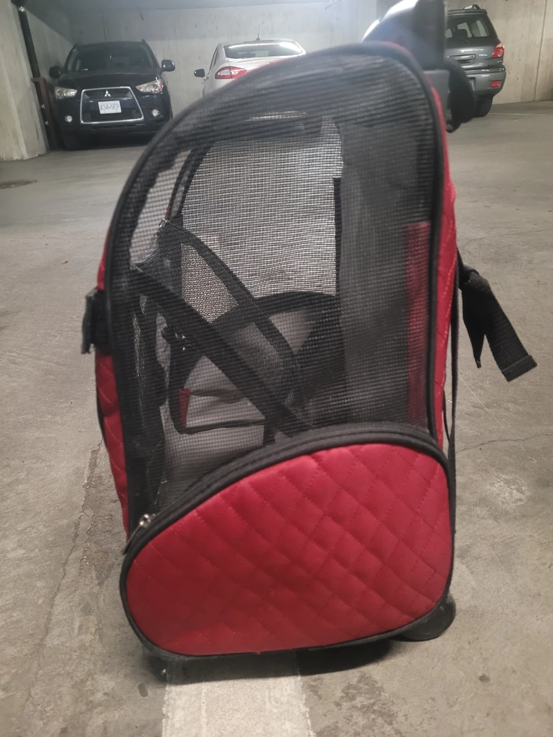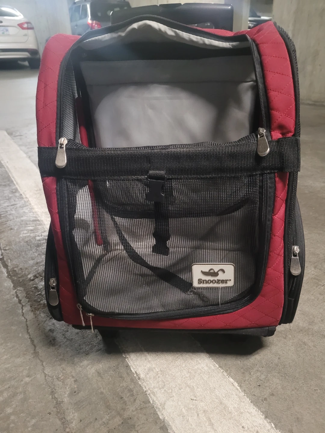 Selling a Snoozer Wheel Around 4-in-1 Pet Carrier in burgundy. This versatile carrier can be used as a backpack, rolling carrier, car seat, or pet bed! It's perfect for travel or everyday use. The carrier features mesh windows for ventilation and visibility, and a comfortable interior for your pet. Great condition! Sell it As-is