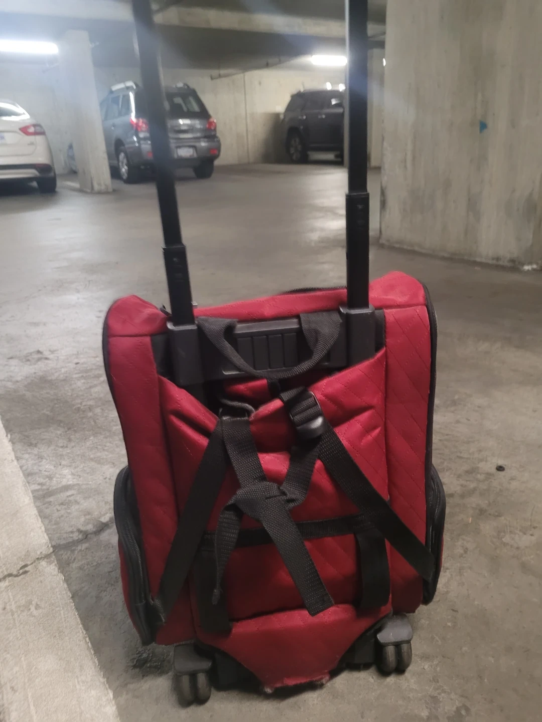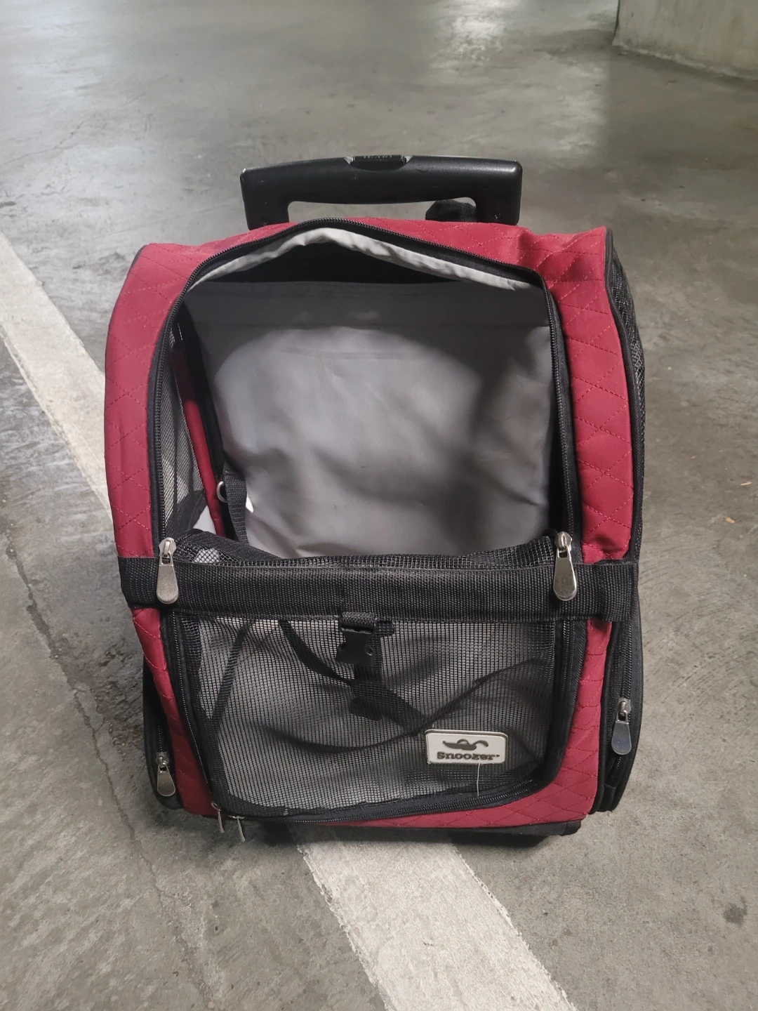 Selling a Snoozer Wheel Around 4-in-1 Pet Carrier in burgundy. This versatile carrier can be used as a backpack, rolling carrier, car seat, or pet bed! It's perfect for travel or everyday use. The carrier features mesh windows for ventilation and visibility, and a comfortable interior for your pet. Great condition! Sell it As-is