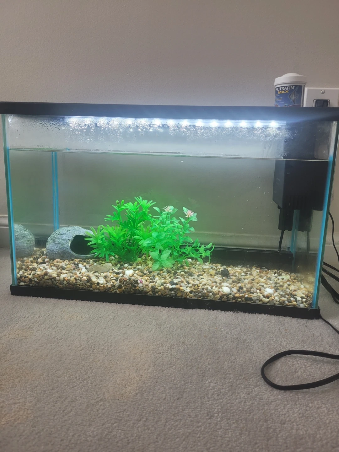 Selling a used fish tank that comes with gravel, a filter, decorative plants, and a decorative rock with a hole. Perfect for getting started with a small aquarium!