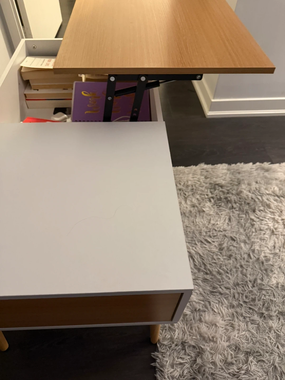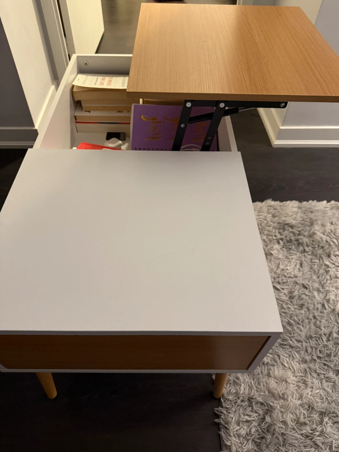 Selling this popular lift-top coffee table! It's in great shape and super functional for small spaces. The lift-top feature makes it easy to work or eat from the couch, and there's storage inside for books or blankets. The table is a mix of white and wood tones, so it fits in with lots of decor styles. It also has a side drawer if you need more storage in a condo space. Super mint condition!