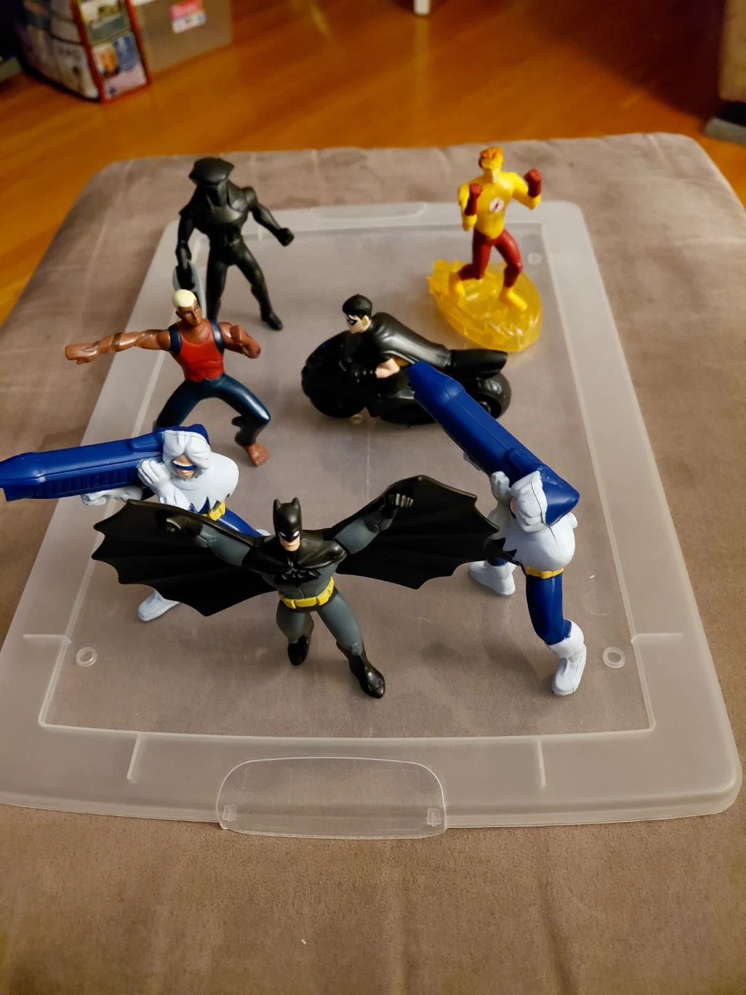 Selling a set of DC Comics action figures! Includes Batman with wings, Kid Flash, Robin on his motorcycle, Aquadlad, Black Manta and Captain Cold. Great for collectors or kids who love superheroes 2011