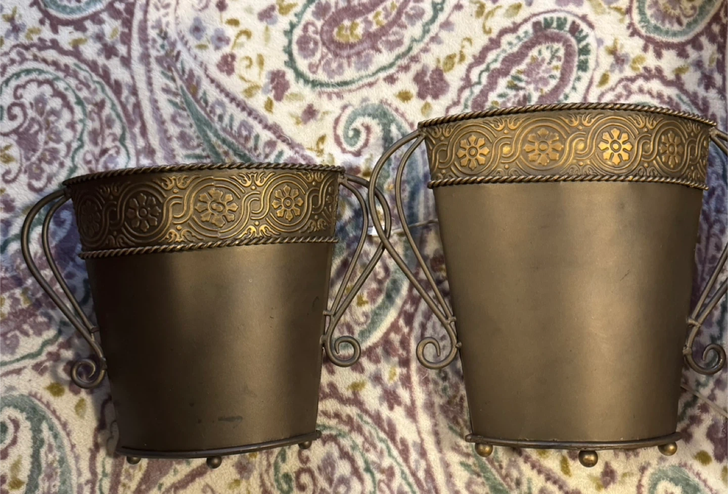 Bronze colored metal wall decor with ornate detailing around the top rim and scroll side handles. Vintage-style and perfect for faux florals or decorative storage. They also have lids (willing to send a photo). Good condition.