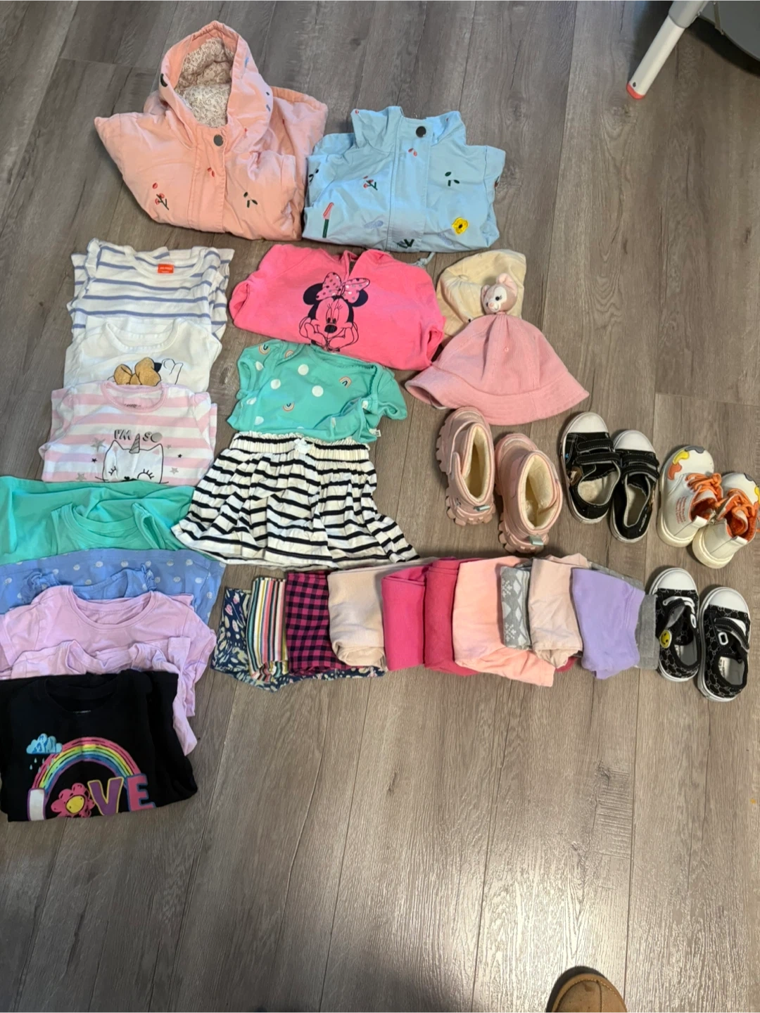Selling a bundle of girls' clothing. Includes a variety of items like shirts, leggings, jackets, and shoes. Different colours and styles are available. Perfect for stocking up!