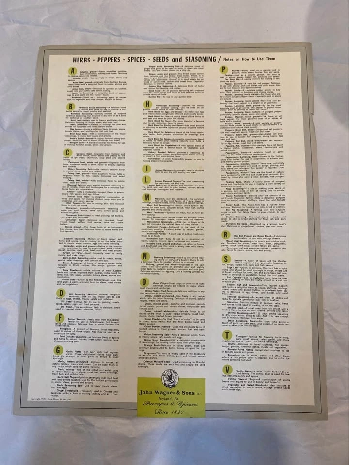 Buy & SellVintage 1961 John Wagner & Sons Spice & Herb Chart PosterVintage 1961 John Wagner & Sons Spice & Herb Chart Poster$20Double-sided poster, 15"x12". Mid-century modern style.WHERE TO MEETRichmondView MapSELLERAllardBlundell422 reviews0 chats·0 favorites·16 viewsSEND CHAT TO SELLERHi Allard! I’m interested in your listing.Hi Allard! I’m interested in your listing.Get the Karrot app to chatSign In to chat