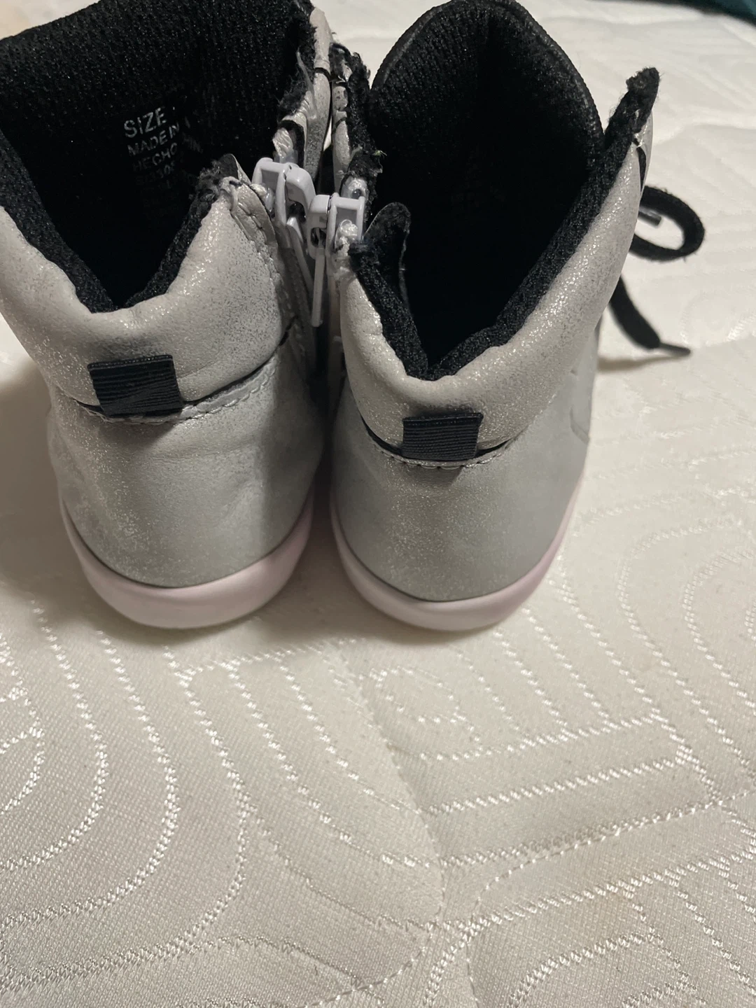Cute pair of GAP kids high top sneakers in silver. They have black laces and a zipper on the side for easy on and off. Size 7c. Shoes as is.